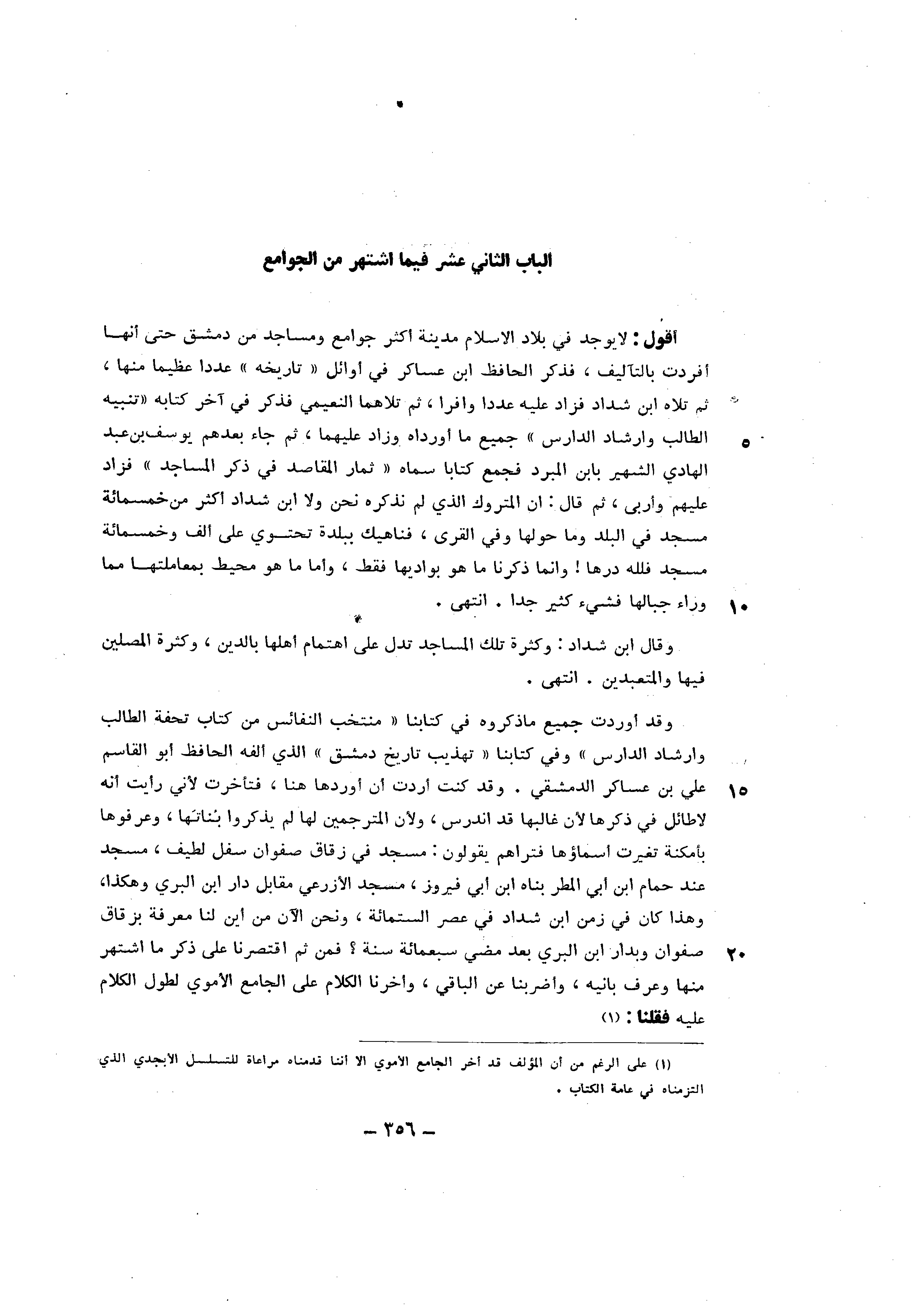 أَقُول لَا يُوجد فِي بِلَاد الاسلام مَدِينَة أَكثر جَوَامِع ومساجد من دمشق حَتَّى انها أفردت بالتآليف فَذكر الْحَافِظ ابْن عَسَاكِر فِي أَوَائِل تَارِيخه عددا عَظِيما مِنْهَا ثمَّ تلاه ابْن شَدَّاد فَزَاد عَلَيْهِ عددا وافرا ثمَّ تلاهما النعيمي فَذكر فِي آخر كِتَابه تَنْبِيه الطَّالِب وارشاد الدارس جَمِيع مَا أورداه وَزَاد عَلَيْهِمَا ثمَّ جَاءَ بعدهمْ يُوسُف بن عبد الْهَادِي الشهير بِابْن الْمبرد فَجمع كتابا سَمَّاهُ ثمار الْمَقَاصِد فِي ذكر الْمَسَاجِد فَزَاد عليهموأبى ثمَّ قَالَ أَن الْمَتْرُوك الَّذِي لم نذكرهُ نَحن وَلَا ابْن شَدَّاد أَكثر من خَمْسمِائَة مَسْجِد وأربى ثمَّ قَالَ إِن الْمَتْرُوك الَّذِي لم نذكرهُ نَحن وَلَا ابْن شَدَّاد أَكثر من خَمْسمِائَة مَسْجِد فِي الْبَلَد وَمَا حولهَا وَفِي الْقرى فناهيك ببلدة تحتوي على الف وَخَمْسمِائة مَسْجِد فَللَّه درها وانما ذكرنَا مَا هُوَ بواديها فَقَط واما مَا هُوَ مُحِيط بمعاملتها مِمَّا وَرَاء جبالها كثير جدا انْتهى