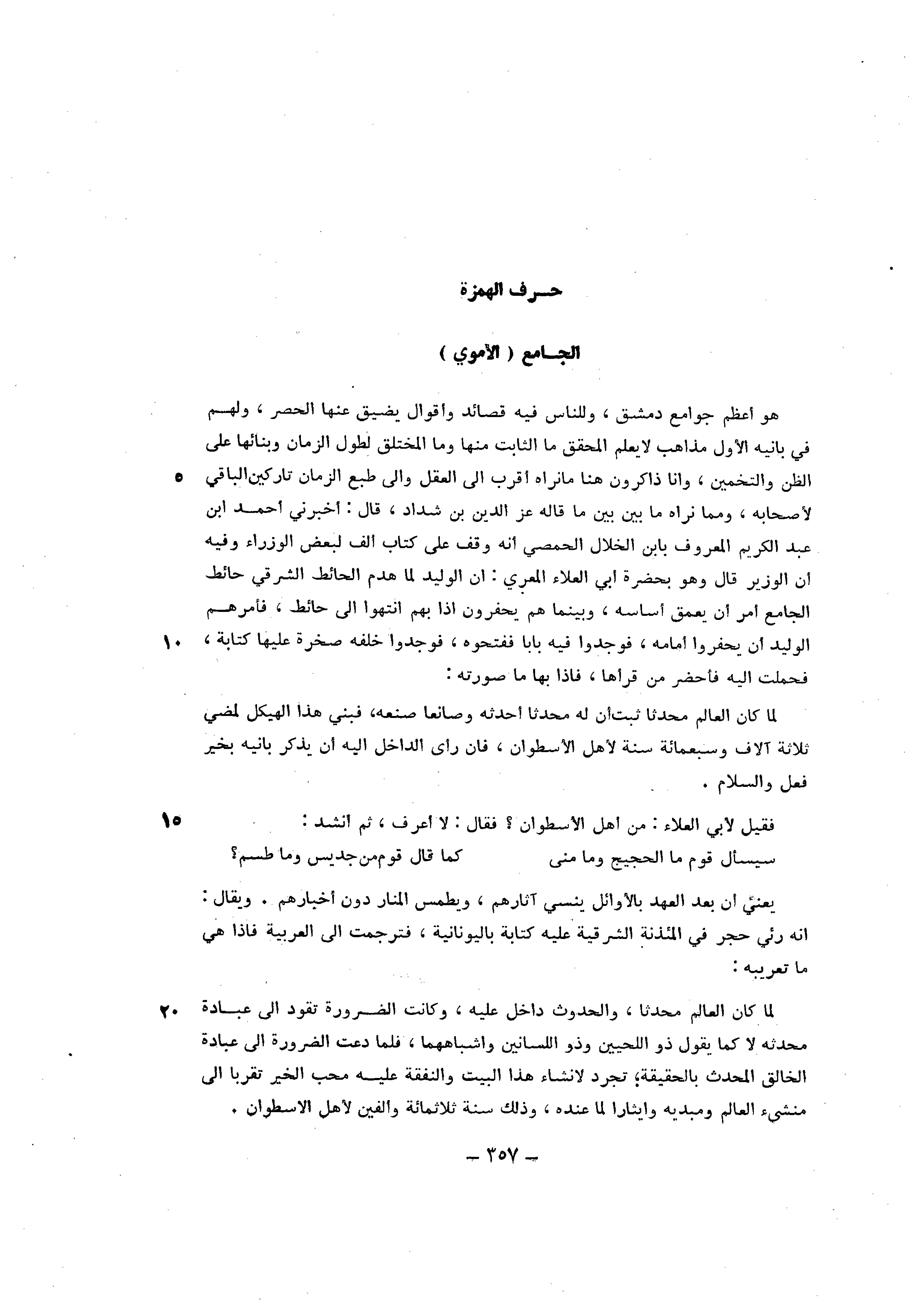 يَعْنِي أَن بعد الْعَهْد بالأوئل ينسي آثَارهم ويطمس الْمنَار دون أخبارهم وَيُقَال أَنه رئي حجر فِي المئذنة الشرقية عَلَيْهِ كِتَابَة باليونانية فترجمت إِلَى الْعَرَبيَّة فاذا هِيَ مَا تعربيه لما كَانَ الْعَالم مُحدثا والحدوث دَاخل عَلَيْهِ وَكَانَت الضَّرُورَة تقود الى عبَادَة محدثه لَا كَمَا يَقُول ذُو اللحيين وَذُو اللسانين واشباهما فَلَمَّا دعت الضَّرُورَة الى عبَادَة الْخَالِق الْمُحدث بِالْحَقِيقَةِ تجرد لانشاء هَذَا الْبَيْت وَالنَّفقَة عَلَيْهِ محب الْخَيْر تقربا الى منشئ الْعَالم ومبديه وايثارا لما عِنْده وَذَلِكَ سنة ثَلَاثمِائَة والفين لأهل الاسطوان