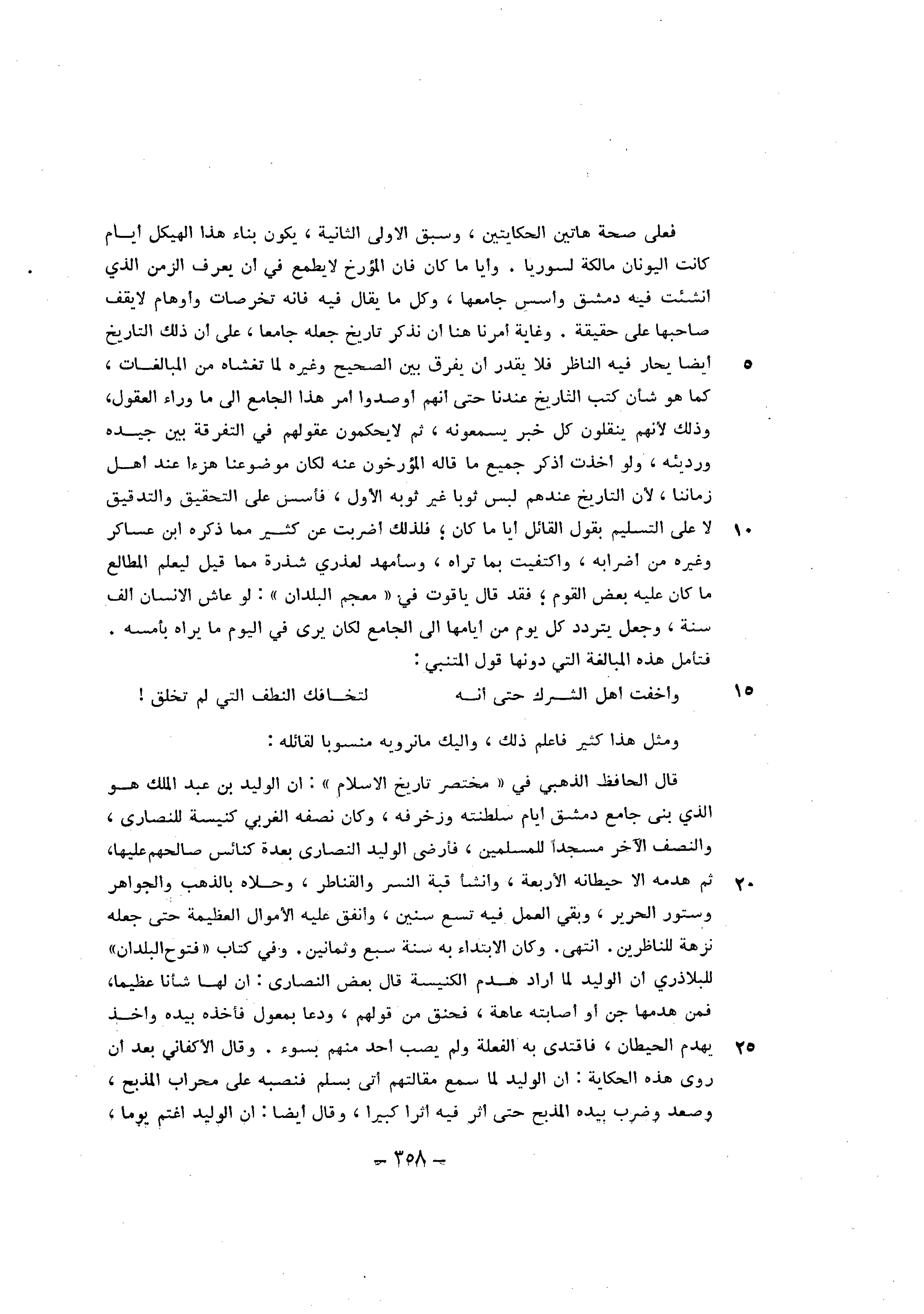 قَالَ الْحَافِظ الذَّهَبِيّ فِي مُخْتَصر تَارِيخ الاسلام ان الْوَلِيد بن عبد الْملك هُوَ الَّذِي بنى جَامع دمشق أَيَّام سلطنتة ورخرفه وَكَانَ نصفه الغربي كَنِيسَة لِلنَّصَارَى وَالنّصف الآخر مَسْجِدا للْمُسلمين فأرضى الْوَلِيد النَّصَارَى بعدة كنائس صَالحهمْ عَلَيْهَا ثمَّ هَدمه الا حيطانه الْأَرْبَعَة وَأَنْشَأَ قبَّة النسْر والقناطر وحلاه بِالذَّهَب والجواهر وستور الْحَرِير وَبَقِي الْعَمَل فِيهِ تسع سِنِين وَأنْفق عَلَيْهِ الاموال الْعَظِيمَة حَتَّى جعله نزهة للناظرين انْتهى وَكَانَ الِابْتِدَاء بِهِ سنة سبع وَثَمَانِينَ وَفِي كتاب فتوح الْبلدَانِ للبلاذري ان الْوَلِيد لما أَرَادَ هدم الْكَنِيسَة قَالَ بعض النَّصَارَى أَن لَهَا شَأْنًا عَظِيما فَمن هدمها جن أَو أَصَابَته عاهة فحنق من قَوْلهم ودعا بمعول فأخذة بِيَدِهِ وَأخذ يهدم الْحِيطَان فاقتدى بِهِ الفعلة وَلم يصب اُحْدُ مِنْهُم بِسوء وَقَالَ الْأَكْفَانِيِّ بعد أَن روى هَذِه الْحِكَايَة أَن الْوَلِيد لما سمع مقالتهم أَتَى بسلم فنصبه على محراب المذبح وَصعد وَضرب بِيَدِهِ المذبح حَتَّى أثر فِيهِ ثرا كَبِيرا وَقَالَ أَيْضا ان الْوَلِيد اغتم يَوْمًا