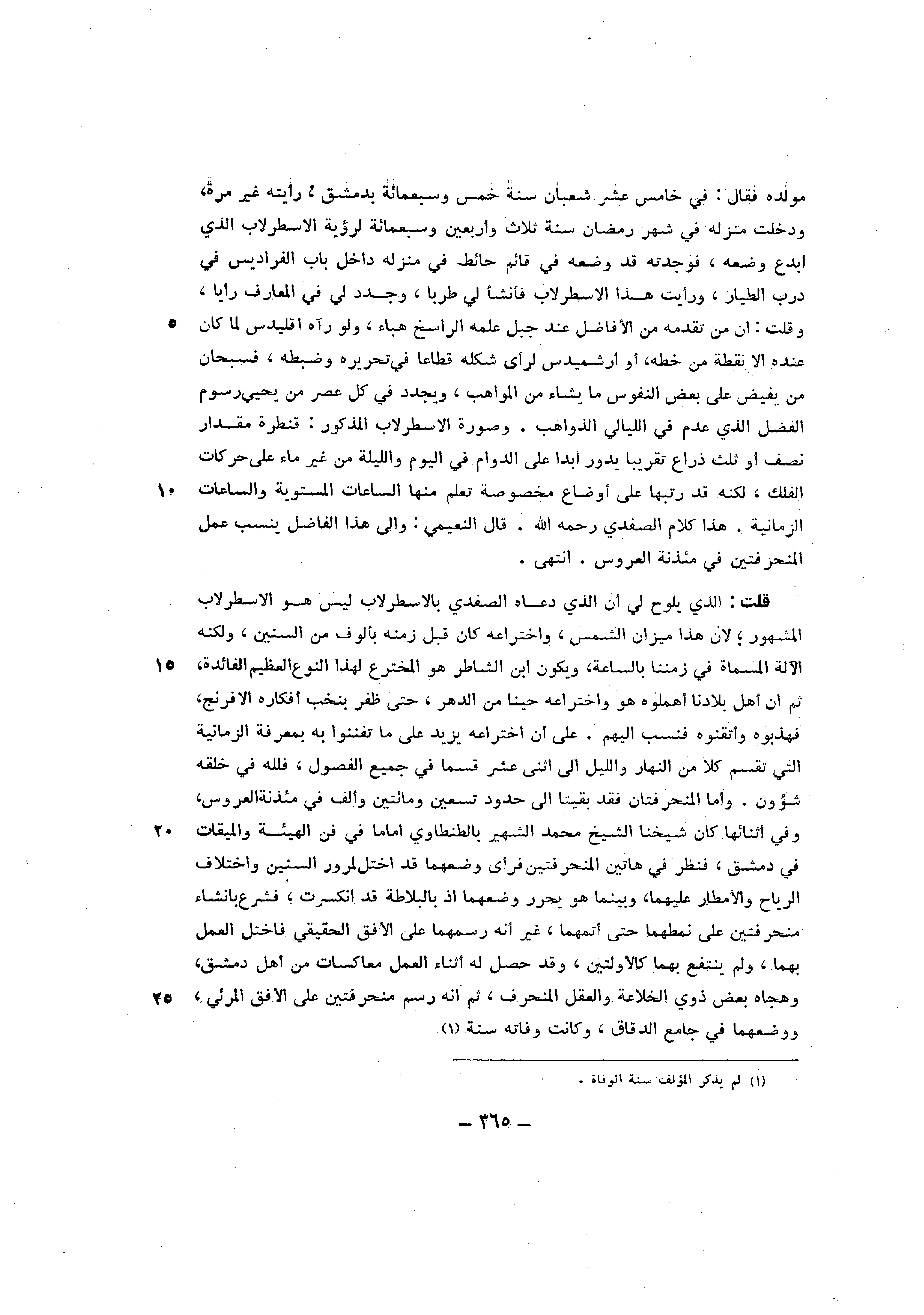 قلت الَّذِي يلوح لي أَن الَّذِي دَعَاهُ الصَّفَدِي الاسطرلاب لَيْسَ هُوَ الاسرلاب الْمَشْهُور لَان هَذَا ميزَان الشم س واختراعه كَانَ قبل زَمَنه بألوف من السنين وَلكنه الْآلَة الْمُسَمَّاة فِي زمننا بالساعة وَيكون أبن الشاطر هُوَ المخترع لهَذَا النَّوْع الْعَظِيم الْفَائِدَة ثمَّ ان أهل بِلَادنَا أهملوه هُوَ واختراعه حينا من الده ر حتي ظفر بنخب أفكاره الافرنج فهذبوه واتقنوه فنسب اليهم على أَن اختراعه يزِيد على مَا تفننوا بِهِ بِمَعْرِِفَة الزمانية التيتقسم كلا من النَّهَار وَاللَّيْل إِلَى اثنى عشر قسما فِي جَمِيع الْفُصُول فَللَّه فِي خلقه شؤون واما المنحرفتان فقد بَقِيَتَا الى حُدُود تسعين وَمِائَتَيْنِ والف فِي مئذنة الْعَرُوس وَفِي أَثْنَائِهَا كَانَ شَيخنَا الشَّيْخ مُحَمَّد الشهير بالطنطاوي اماما فِي فيالهيئة والميقات فِي دمشق فَنظر فِي هَاتين المنحرفتين فَرَأى وضعهما قد اخْتَلَّ لمرور السنين وَاخْتِلَاف الرِّيَاح والامطار عَلَيْهِمَا وبينما هُوَ يحرر وضعهما اذا بالبلاطة قد انْكَسَرت فشرع بانشاءمنحرفتين على نمطهما حَتَّى أتمهما غير أَنه رسمهما على الْأُفق الْحَقِيقِيّ فاختل الْعَمَل بهما وَلم ينْتَفع بهما كالاولتين وَقد حصل لَهُ أثْنَاء الْعَمَل معاكسات من أهل دمشق وهجاه بعض ذَوي الخلاعة وَالْعقل المنحرف ثمَّ انه رسم منحرفتين على الافق المرئي وَوَضعهمَا فِي جَامع الدقاق وَكَانَت وَفَاته سنة