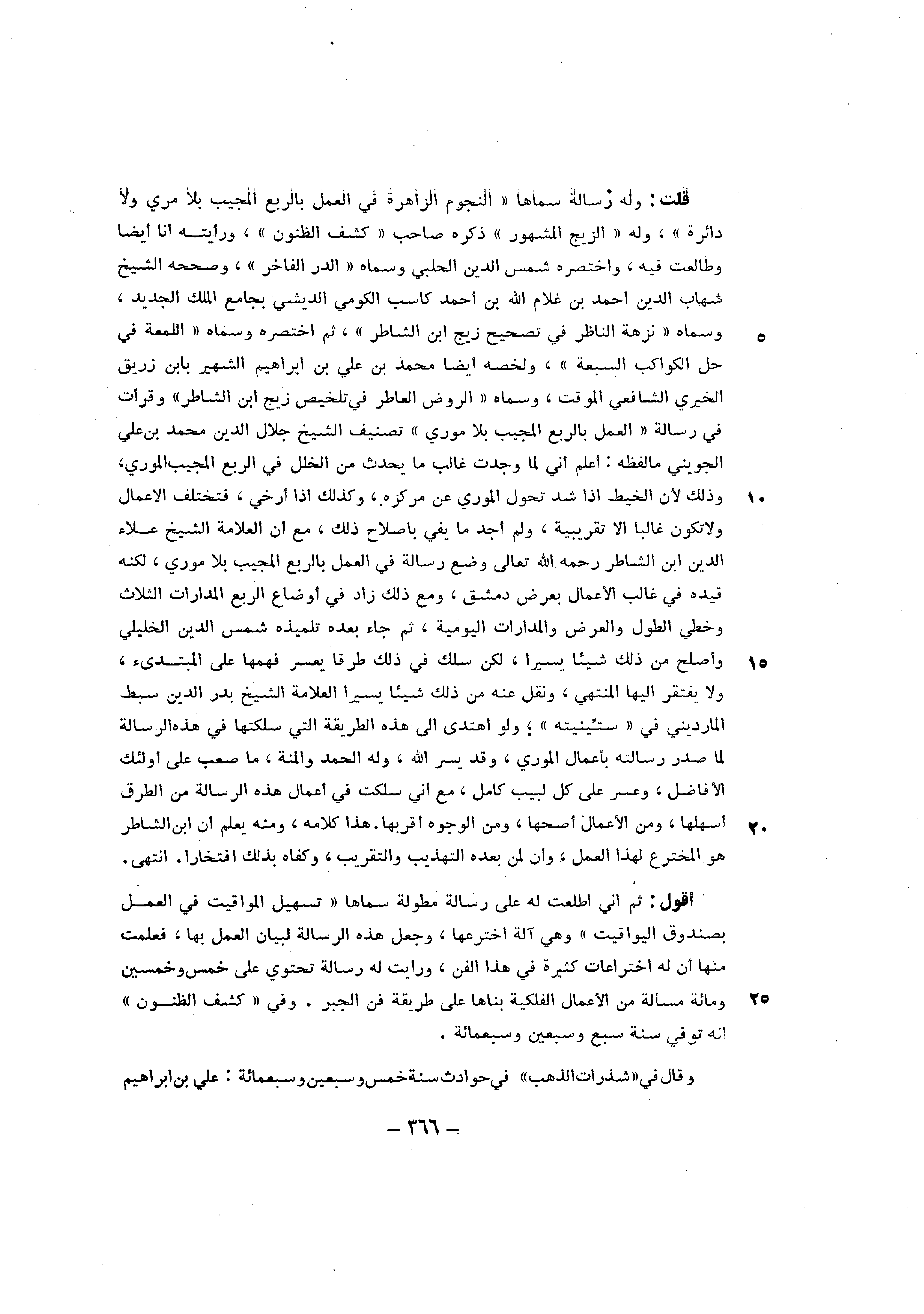 قلت وَله رِسَالَة سَمَّاهَا النُّجُوم الزاهرة فِي الْعَمَل بِالربعِ الْمُجيب بِلَا مري وَلَا دَائِرَة وَله الزيج الْمَشْهُور ذكره صَاحب كشف الظنون ورايته انا أَيْضا وطالعت فِيهِ وَاخْتَصَرَهُ شمس الدّين الْحلَبِي وَسَماهُ الدّرّ الفاخر وَصَححهُ الشَّيْخ شهَاب الدّين احْمَد بن غُلَام الله بن احْمَد كاسب الكومي الديشي بِجَامِع الْملك الْجَدِيد وَسَماهُ نزهة النَّاظر فِي تَصْحِيح زيج ابْن الشاطر ثمَّ اخْتَصَرَهُ وَسَماهُ اللمْعَة فِي حل الْكَوَاكِب السَّبْعَة ولخصه أَيْضا مُحَمَّد بن عَليّ ابراهيم الشهير بِابْن زُرَيْق الخيري الشَّافِعِي الموقت وَسَماهُ الرَّوْض العاطر فِي تَلْخِيص زيج ابْن الشاطر وقرات فِي رِسَالَة الْعَمَل بِالربعِ الْمُجيب بِلَا موري تصنيف الشَّيْخ جلال الدّين مُحَمَّد بن عَليّ الْجُوَيْنِيّ مالفظه اعْلَم اني لما وجدت غَالب مَا يحدث من الْخلَل فِي الرّبع الْمُجيب الموري وَذَلِكَ لِأَن الْخَيط اذا شدّ تحول الموري عَن مركزه وَكَذَلِكَ اذا أرخي فتختلف الاعمال وَلَا تكون غَالِبا الا تقريبية وَلم أجد مَا يَفِي باصلاح ذَلِك مَعَ ان الْعَلامَة الشَّيْخ عَلَاء الدّين ابْن الشاطر رَحمَه الله تَعَالَى وضع رِسَالَة فِي الْعَمَل بِالربعِ الْمُجيب بِلَا موري لكنه قَيده فِي غَالب الاعمال بعرضدمشق وَمَعَ ذَلِك زَاد فِي أوضاع الرّبع المدارات الثَّلَاث وخطي الطول وَالْعرض والمدارات اليومية ثمَّ جَاءَ بعده تِلْمِيذه شمس الدّين الخليلي وَأصْلح من ذَلِك شَيْئا يَسِيرا لَكِن سلك فِي ذَلِك طرقا يعسر فهمها على المبتدىء وَلَا يفْتَقر اليها المنتهي وَنقل عَنهُ من ذَلِك شَيْئا يَسِيرا الْعَلامَة الشَّيْخ بدر الدّين سبط المارديني فِي ستينيته وَلَو اهْتَدَى الى هَذِه الطَّرِيقَة الَّتِي سلكتها فِي هَذِه الرسَالَة لما صدر رسَالَته بأعمال الموري وَقد يسر الله وَله الْحَمد والْمنَّة مَا صَعب على أولئكالافاضل وعسر على كل لَبِيب كَامِل مَعَ أَنِّي سلكت فِي أَعمال هَذِه الرسَالَة من الطّرق أسهلها وَمن الاعمال أَصَحهَا وَمن الْوُجُوه أقربها هَذَا كَلَامه وَمِنْه يعلم ان ابْن الشاطر هُوَ المخترع لهَذَا الْعَمَل وَأَن لمن بعده التَّهْذِيب والتقريب وَكَفاهُ بذلك افتخارا انتهي