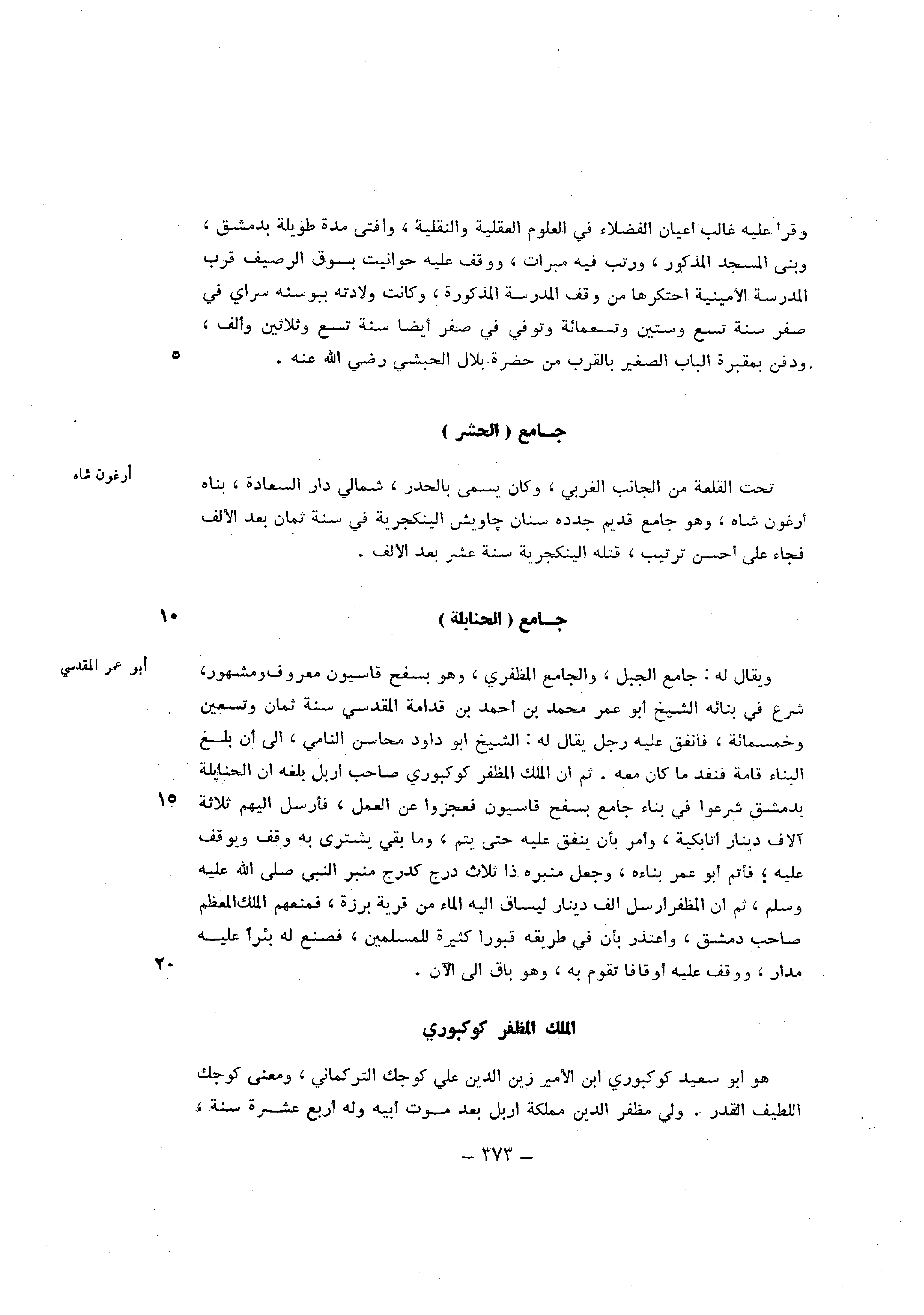 وَيُقَال لَهُ جَامع الْجَبَل وَالْجَامِع المظفري وَهُوَ بسفح قاسيون مَعْرُوف ومشهور شرع فِي بنائِهِ الشَّيْخ أَبُو عمر مُحَمَّد بن احْمَد بن قدامَة الْمَقْدِسِي سنة ثَمَان وَتِسْعين وَخَمْسمِائة فأنفق عَلَيْهِ رجل يُقَال لَهُ الشَّيْخ ابو دَاوُد محَاسِن النامي الى ان بلغ الْبناء قامة فنفذ مَا كَانَ مَعَه ثمَّ ان الْملك المظفر كوكبوري صَاحب اريل بلغه ان الْحَنَابِلَة بِدِمَشْق شرعوا فِي بِنَاء جَامع بسفح قاسيون فعجزوا عَن الْعَمَل فَأرْسل اليهم ثَلَاثَة الآف دِينَار اتابكية وامر بَان ينْفق عَلَيْهِ حَتَّى يتم وَمَا بَقِي يشترى بِهِ وقف وَيُوقف عَلَيْهِ فاتم ابو عمر بناءه وَجعل منبره ذَا ثَلَاث درج كدرج مِنْبَر النَّبِي صلى الله عَلَيْهِ وَسلم ثمَّ ان المظفر أرسل ألف دِينَار لسياق اليه المَاء من قَرْيَة بَرزَة فَمَنعهُمْ الْملك الْمُعظم صَاحب دمشق وأعتذر بِأَن فِي طَرِيقه قبورا كَثِيرَة للْمُسلمين فَصنعَ لَهُ بِئْرا عَلَيْهِ مدَار ووقف عَلَيْهِ أوقافا تقوم بِهِ وَهُوَ بَاقٍ الى الْآن