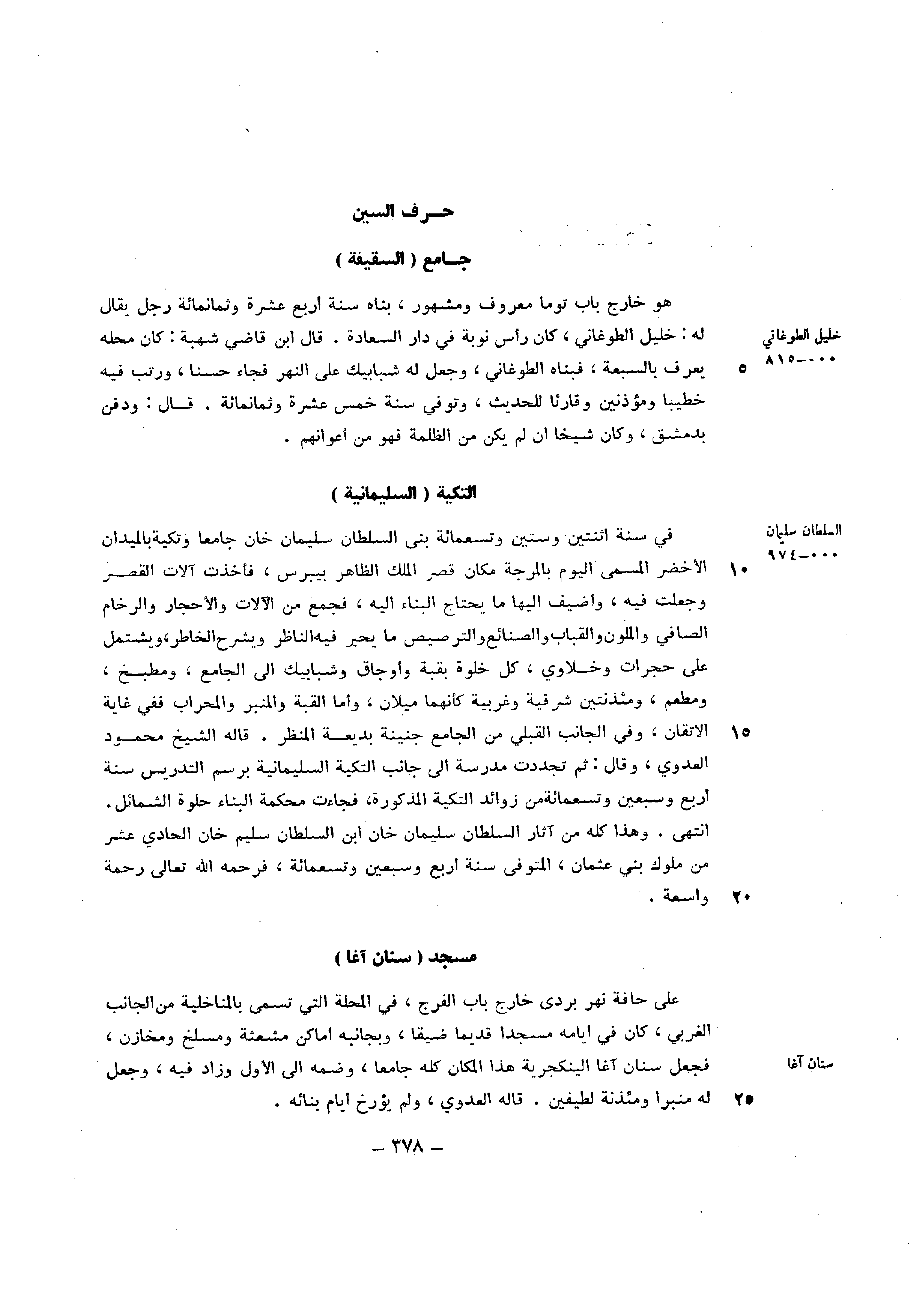 فِي سنة اثْنَتَيْنِ وَسِتِّينَ وَتِسْعمِائَة بنى السُّلْطَان سُلَيْمَان خَان جَامعا وتكية بالميدان الاخضر الْمُسَمّى الْيَوْم بالمرجة مَكَان قصر الْملك الظَّاهِر بيبرس فَأخذت آلَات الْقصر وَجعلت فِيهِ وأضيف اليها مَا يحْتَاج الْبناء اليه فَجمع من الْآلَات والأحجار والرخام الصافي والملون والقباب والصنائع والترصيص مَا يحير فِيهِ النَّاظر ويشرح الخاطر ويشتمل على حجرات وخلاوي كل خلْوَة بقبة وأوجاق وشبابيك الى الْجَامِع ومطبخ ومطعم مئذنيتن شرقية وغربية كَأَنَّهُمَا ميلان وَأما الْقبَّة والمنبر والمحراب فَفِي غَايَة الاتقان وَفِي الْجَانِب القبلي من الْجَامِع جنينة بديعة المنظر قَالَه الشَّيْخ مَحْمُود الْعَدوي وَقَالَ ثمَّ تَجَدَّدَتْ مدرسة الى جَانب التكية السليمانية برسم التدريس سنة أَربع وَسبعين وَتِسْعمِائَة من زاوئد التكية الْمَذْكُورَة فَجَاءَت محكمَة الْبناء حلوة الشَّمَائِل انْتهى وَهَذَا كُله من آثَار السُّلْطَان سُلَيْمَان خَان ابْن السُّلْطَان سليم خَان الْحَادِي عشرمن مُلُوك بني عُثْمَان الْمُتَوفَّى سنة أَربع وَسبعين وَتِسْعمِائَة فرحمه الله تَعَالَى رَحْمَة وَاسِعَة