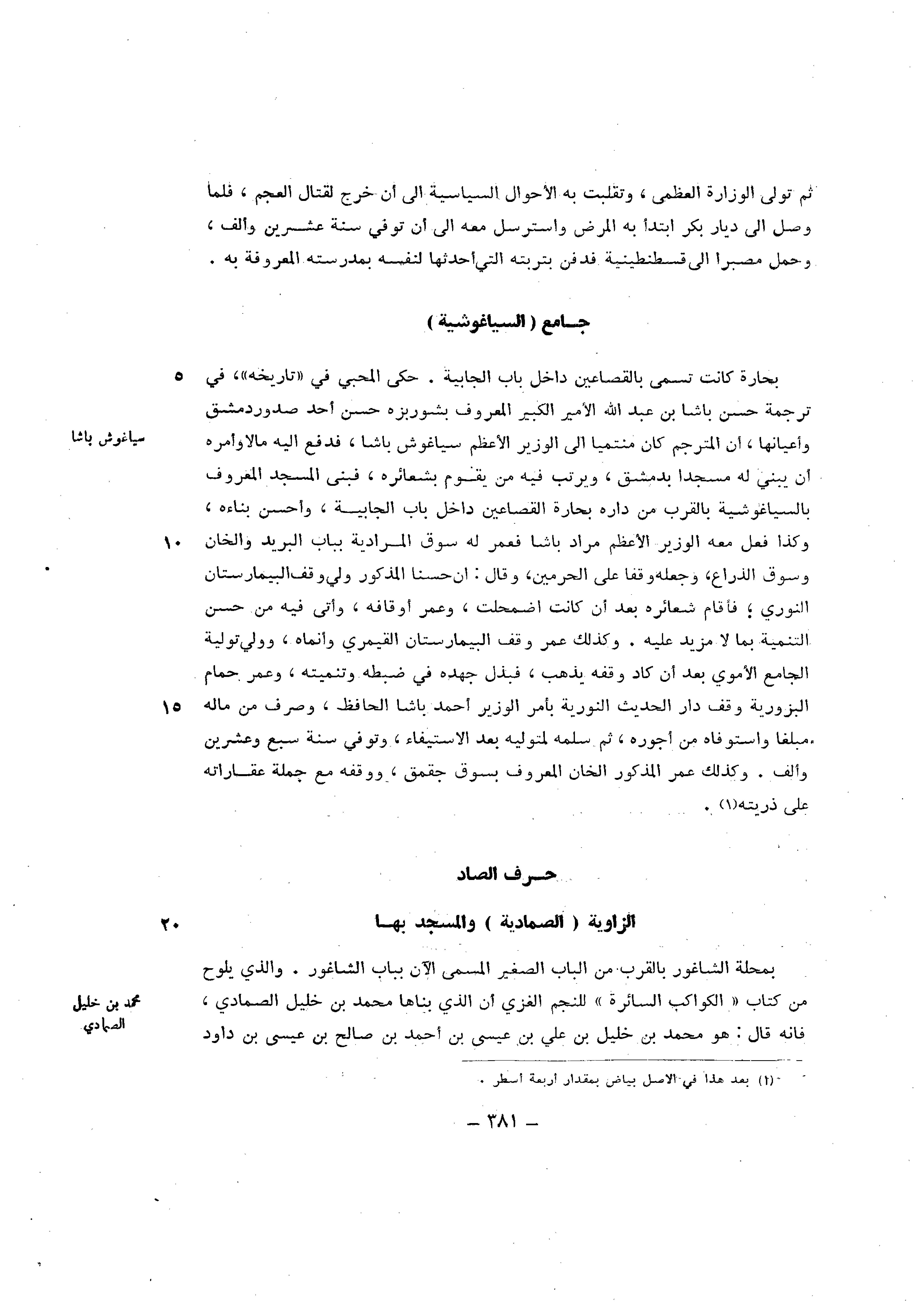 بحارة كَانَت تسمى بالقصاعين دَاخل بَاب الْجَابِيَة حكى المحبي فِي تَارِيخه فِي تَرْجَمَة حسن باشا بن عبد الله الْأَمِير الْكَبِير الْمَعْرُوف بشوربزه حسن أحد صُدُور دمشق وأعيانها أَن المترجم كَانَ منتميا الى الْوَزير الْأَعْظَم سياغوش باشا فَدفع اليه مَالا وَأمره ان بيني لَهُ مَسْجِدا بِدِمَشْق ويرتب فِيهِ من يقوم بشعائره فَبنى الْمَسْجِد الْمَعْرُوف بالسياغوشية بِالْقربِ من دَاره بحارة القصاعين دَاخل بَاب الْجَابِيَة وَأحسن بناءه وَكَذَا فعل مَعَه الْوَزير الاعظم مُرَاد باشا فعمر لَهُ سوق المرادية بِبَاب الْبَرِيد والخان وسوق الذِّرَاع وَجعله وَقفا على الْحَرَمَيْنِ وَقَالَ ان حسنا الْمَذْكُور ولي وقف البيمارستان النوري فَأَقَامَ شعائره بعد ان كَانَت اضمحلت وَعمر أوقافه وأتى فِيهِ من حسن التنمية بِمَا لَا مزِيد عَلَيْهِ وَكَذَلِكَ عمر وقف البيمارستان القيمري وأنماه وَولي توليه الْجَامِع الْأمَوِي بعد ان كَاد وَقفه يذهب فبذل جهده فِي ضَبطه وتنميته وَعمر حمام البزورية وقف دَار الحَدِيث النوريه بِأَمْر الْوَزير أَحْمد باشا الْحَافِظ وَصرف من مَاله مبلغا واستوفاه من أجوره ثمَّ سلمه لمتوليه بعد الِاسْتِيفَاء وَتُوفِّي سنة سبع وَعشْرين وَألف وَكَذَلِكَ عمر الْمَذْكُور الخان الْمَعْرُوف بسوق جقمق وَوَقفه مَعَ جملَة عقاراته على ذُريَّته