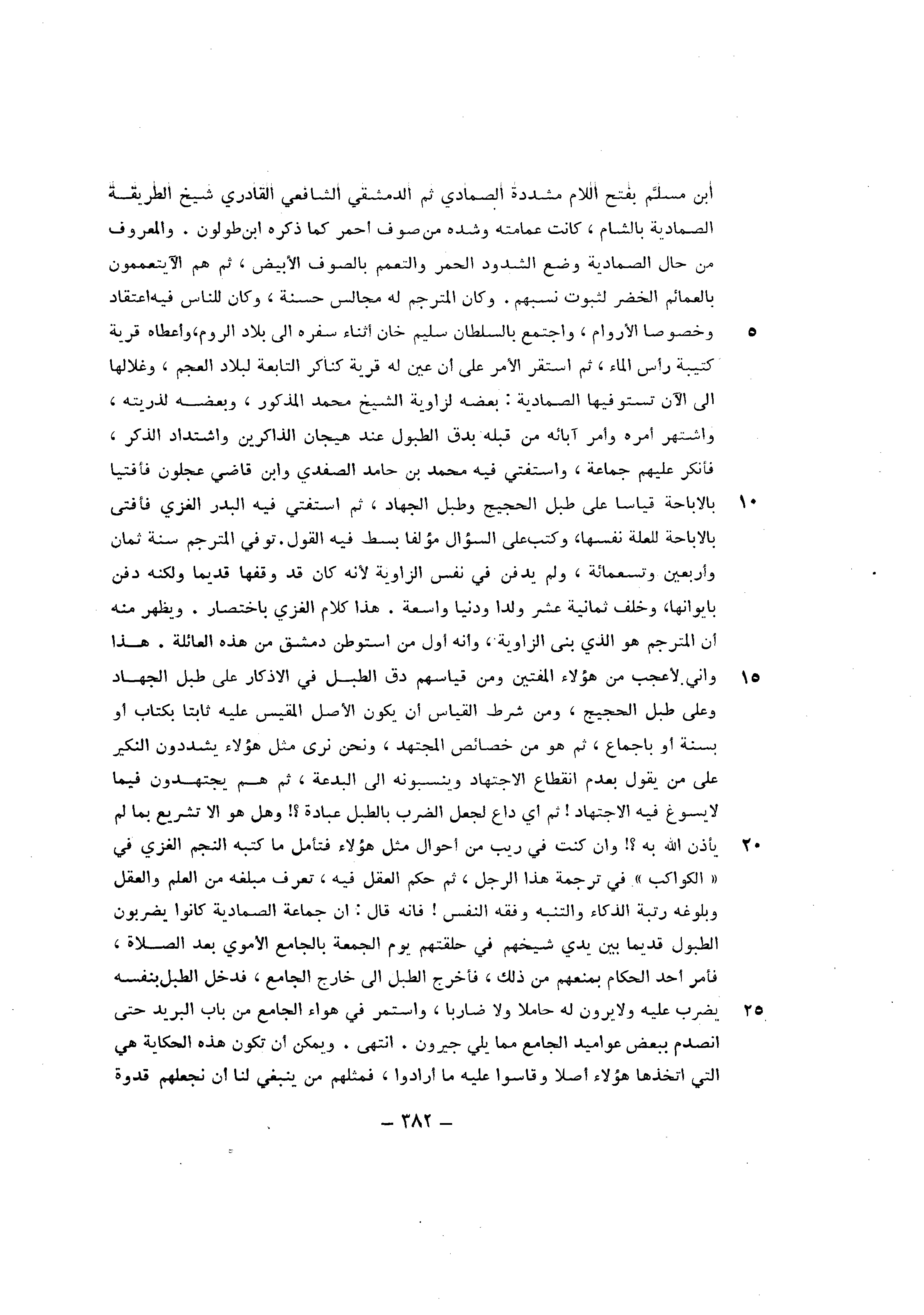 ابْن مُسلم بِفَتْح اللَّام مُشَدّدَة الصمادي ثمَّ الدِّمَشْقِي الشَّافِعِي القادري شيخ الطَّرِيقَة الصمادية بِالشَّام كَانَت عمَامَته وشده من صوف أَحْمَر كَمَا ذكره ابْن طولون وَالْمَعْرُوف من حَال الصمادية وضع الشدود الْحمر والتعمم بالصوف الْأَبْيَض ثمَّ هم الْآن يتعممون بالعمائم الْخضر لثُبُوت نسبهم وَكَانَ المترجم لَهُ مجَالِس حَسَنَة وَكَانَ للنَّاس فِيهِ اعْتِقَاد وخصوصا الاروام وَاجْتمعَ بالسلطان سليم خَان اثناء سَفَره الى بِلَاد الرّوم واعطاه قَرْيَة كَتِيبَة رَأس المَاء ثمَّ اسْتَقر الامر على ان عين لَهُ قَرْيَة كناكر التابعة لبلاد الْعَجم وغلالها الى الْآن تستوفيها الصمادية بعضه لزاوية الشَّيْخ مُحَمَّد الْمَذْكُور وَبَعضه لذريته واشتهر امْرَهْ وامر آبَائِهِ من قبله بدق الطبول عِنْد هيجان الذَّاكِرِينَ واشتداد الذّكر فَأنْكر عَلَيْهِم جمَاعَة واستفتي فِيهِ مُحَمَّد بن حَامِد الصَّفَدِي وَابْن قَاضِي عجلون فأفتيا بالاباحة قِيَاسا على طبل الحجيج وطبل الْجِهَاد ثمَّ استفتى فِيهِ الْبَدْر الْغَزِّي فَأفْتى بالاباحة لِلْعِلَّةِ نَفسهَا وَكتب على السُّؤَال مؤلفا بسط فِيهِ القَوْل توفّي المترجم سنة ثَمَان وَأَرْبَعين وَتِسْعمِائَة وَلم يدْفن فِي نفس الزاوية لِأَنَّهُ كَانَ قد وَقفهَا قَدِيما وَلكنه دفن بايوانها وَخلف ثَمَانِيَة عشر ولدا وَدُنْيا وَاسِعَة هَذَا كَلَام الْغَزِّي بِاخْتِصَار وَيظْهر مِنْهُ ان المترجم هُوَ الَّذِي بنى الزاوية وانه أول من استوطن دمشق من هَذِه العائلة هَذَا واني لأعجب من هولاء الْمُفْتِينَ وَمن قياسهم دق الطبل فِي الاذكار على طبل الْجِهَاد وعَلى طبل الحجيج وَمن شَرط الْقيَاس ان يكون الأَصْل الْمَقِيس عَلَيْهِ ثَابتا بِكِتَاب أَو بِسنة أَو باجماع ثمَّ هُوَ من خَصَائِص الْمُجْتَهد وَنحن نرى مثل هَؤُلَاءِ يشددون النكير على من يَقُول بِعَدَمِ انْقِطَاع الِاجْتِهَاد وينسبونه الى الْبِدْعَة ثمَّ هم يجتهدون فيمالا يسوغ فِيهِ الِاجْتِهَاد ثمَّ أَي دَاع لجعل الضَّرْب بالطبل عبَادَة وَهل هُوَ الا تشريع بِمَا لم يَأْذَن الله بِهِ وان كنت فِي ريب من أَحْوَال مثل هَؤُلَاءِ فتامل مَا كتبه النَّجْم الْغَزِّي فِي الْكَوَاكِب فِي تَرْجَمَة هَذَا الرجل ثمَّ حكم الْعقل فِيهِ تعرف مبلغه من الْعلم وَالْعقل وبلوغة رُتْبَة الذكاء والتنبه وَفقه النَّفس فانه قَالَ ان جمَاعَة الصمادية كَانُوا يضْربُونَ الطبول قَدِيما بَين يَدي شيخهم فِي حلقتهم يَوْم الْجُمُعَة بالجامع الاموي بعد الصَّلَاة فَأمر أحد الْحُكَّام بمنعهم من ذَلِك فَأخْرج الطبل خَارج الى الْجَامِع فَدخل الطبل بِنَفسِهِ يضْرب عَلَيْهِ وَلَا يرَوْنَ لَهُ حَامِلا وَلَا ضَارِبًا وَاسْتمرّ فِي هَوَاء الْجَامِع من بَاب الْبَرِيد حَتَّى انصدم بِبَعْض عواميد الْجَامِع مِمَّا يَلِي جيرون انْتهى وَيُمكن أَن تكون هَذِه الْحِكَايَة هِيَ الَّتِي اتخذها هَؤُلَاءِ أصلا وقاسوا عَلَيْهِ مَا أراداوا فمثلهم من يَنْبَغِي لنا أَن نجعلهم قدوة