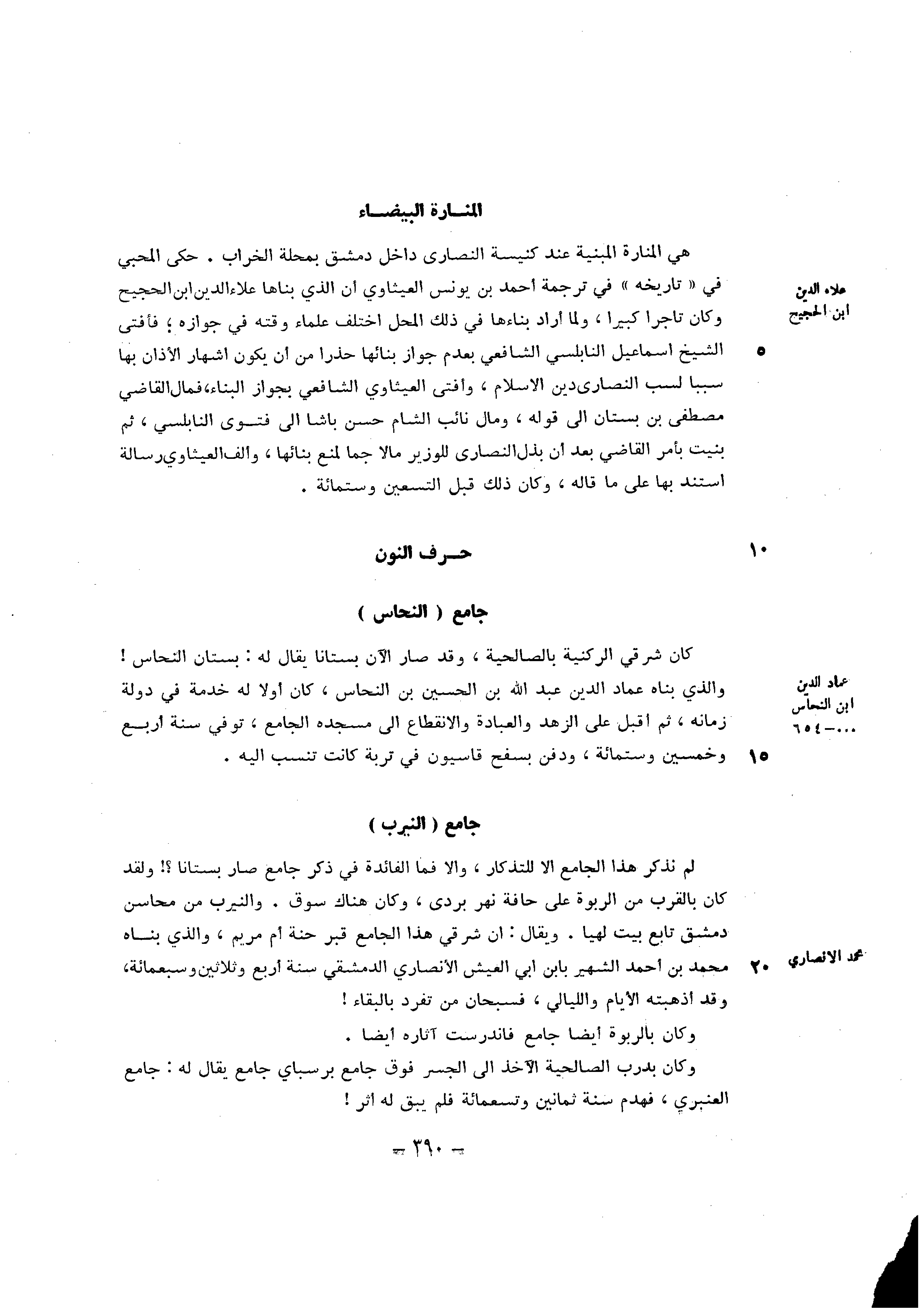 هِيَ المنارة المبنية عِنْد كَنِيسَة النصاري دَاخل دمشق بمحلة الخراب حكى المحبي فِي تَارِيخه فِي تَرْجَمَة أَحْمد بن يُونُس العيثاوي ان الَّذِي بناها عَلَاء الدّين ابْن الحجيج وَكَانَ تَاجر كَبِيرا وَلما أَرَادَ بناءها فِي ذَلِك الْمحل اخْتلف عُلَمَاء وقته فِي جَوَازه فأفتي الشَّيْخ أسماعيل النابلسي الشَّافِعِي بِعَدَمِ جَوَاز بنائها حذارمن ان يكون اشهار الاذان بهَا سَببا لسَبَب النصاري دين الاسلام وافبي العيثاوي الشَّافِعِي بِجَوَاز الْبناء فَمَال القَاضِي مصطفي بن بُسْتَان الى قَوْله وَمَال نَائِب الشَّام حسن باشا الى فتوي النابلسي ثمَّ بنيت بِأَمْر القَاضِي بعد أَن بذل النصاري للوزير مَالا جما لمنع بنائها وَألف العيثاوي رِسَالَة اسْتندَ بهَا على مَا قَالَه وَكَانَ ذَلِك قبل التسعين وسِتمِائَة