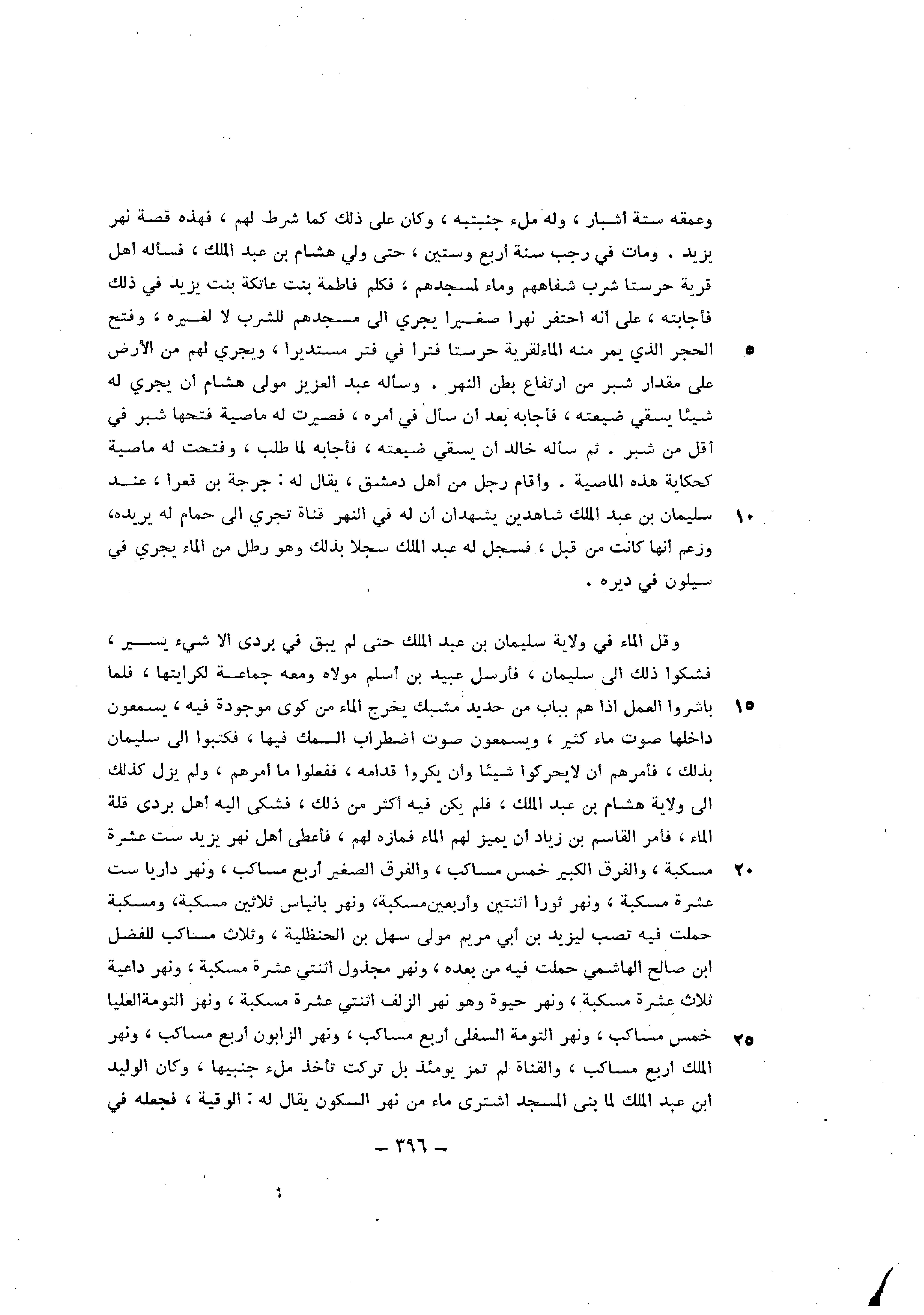 وَقل المَاء فِي ولَايَة سُلَيْمَان بن عبد الْملك حَتَّى لم يبْق فِي بردى الا شَيْء يسير فشكوا ذَلِك الى سُلَيْمَان فَأرْسل عبيد بن أسلم مَوْلَاهُ وَمَعَهُ جمَاعَة لكرايتها فَلَمَّا باشروا الْعَمَل اذا هم بِبَاب من حَدِيد مشبك يخرج المَاء من كوى مَوْجُودَة فِيهِ يسمعُونَ داخلها صَوت مَاء كثير ويسمعون صَوت اضْطِرَاب السّمك فِيهَا فَكَتَبُوا الى سُلَيْمَان بذلك فَأَمرهمْ ان لَا يحركوا شَيْئا وَأَن يكروا قدامه فَفَعَلُوا مَا أَمرهم وَلم يزل كَذَلِك الى ولَايَة هِشَام بن عبد الْملك فَلم يكن فِيهِ أَكثر من ذَلِك فَشكى اليه أهل بردى قلَّة المَاء فَأمر الْقَاسِم بن زِيَاد ان يُمَيّز لَهُم المَاء فمازه لَهُم فَأعْطى أهل نهر يزِيد سِتّ عشرَة مسكبة وَالْفرق الْكَبِير خمس مساكب وَالْفرق الصَّغِير أَربع مساكب ونهر داريا سِتّ عشر مسكبة ونهر ثورا اثْنَتَيْنِ وَأَرْبَعين مسكبة ونهر بانياس ثَلَاثِينَ مسكبة ومسكبة حملت فِيهِ تصب ليزِيد بن أبي مَرْيَم مولى سهل بن الحنظلية وَثَلَاث مساكب للفضل ابْن صَالح الْهَاشِمِي حملت فِيهِ من بعده ونهر مجذول اثْنَتَيْ عشرَة مسكبة ونهر دَاعِيَة ثَلَاث عشرَة مسكبة ونهر حَيْوَة وَهُوَ نهر الزلف اثْنَتَيْ عشرَة مسكبة ونهر التومة الْعليا خمس مساكب ونهر التومة السُّفْلى أَربع مساكب ونهر الزابون أَربع مساكب ونهر الْملك أَربع مساكب والقناة لم تمز يَوْمئِذٍ بل تركت تَأْخُذ ملْء جنبيها وَكَانَ الْوَلِيد ابْن عبد الْملك لما بنى الْمَسْجِد اشْترى مَاء من نهر السّكُون يُقَال لَهُ الوقية فَجعله فِي