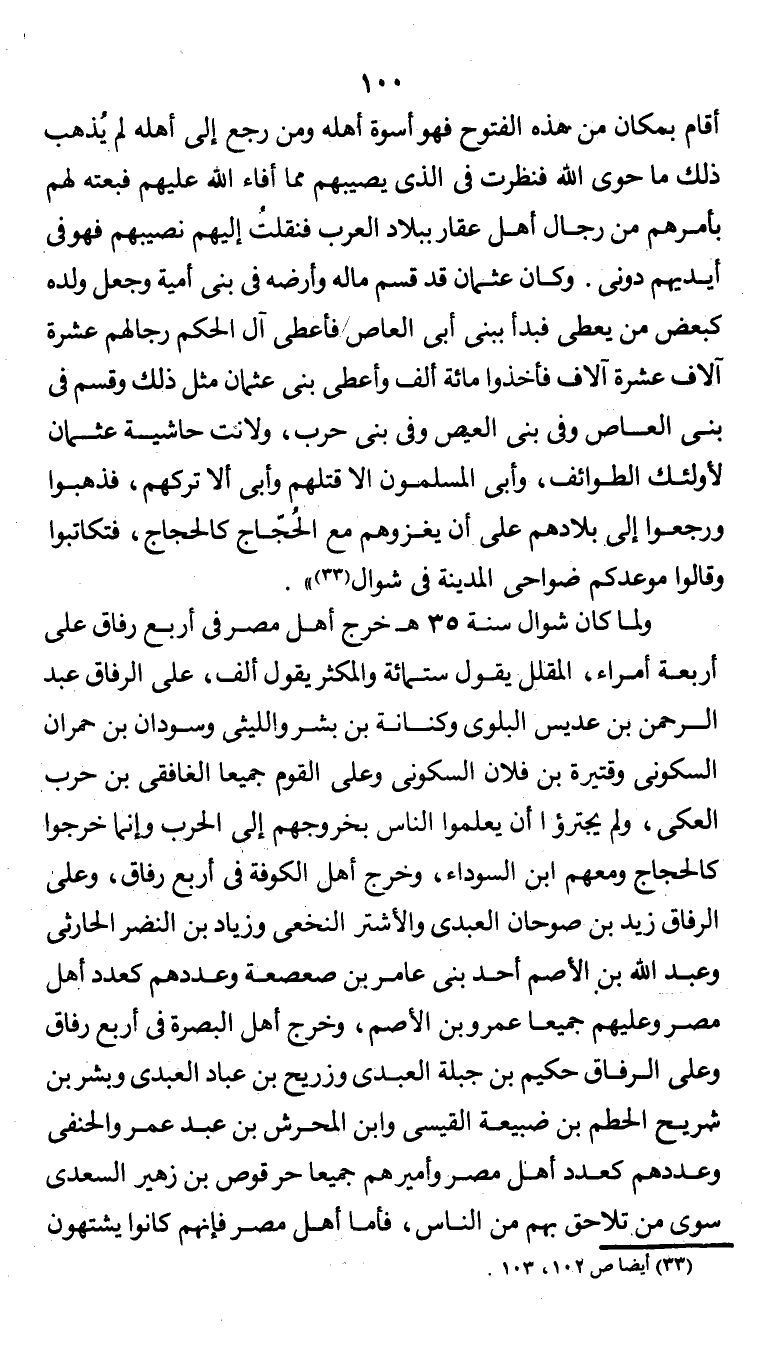 أقام بمكان من هذه الفتوح فهو أسوة أهله ومن رجع إلى أهله لم يذهب ذلك ما حوى الله فنظرت في الذي يصيبهم مما أفاء الله عليهم فبعته لهم بأمرهم من رجال أهل عقار ببلاد العرب فنقلت إليهم نصيبهم فهو في أيديهم دوني. وكان عثمان قد قسم ماله وأرشه في بني أمية وجعل ولده كبعض من يعطى فبدأ ببني أبي العاص فأعطى آل الحكم رجالهم عشرة آلاف فأخذوا مائة ألف وأعطى بني عثمان مثل ذلك وقسم في بني العاص وفي بني العيص وفي بني حرب، ولانت حاشية عثمان لأولئك الطوائف، وأبى المسلمون إلا قتلهم وأبى إلا تركهم، فذهبوا ورجعوا إلى بلادهم على أن يغزوهم مع الحُجاج كالحجاج، فتكاتبوا وقالوا موعدكم ضواحي المدينة في شوال (¬1) ".