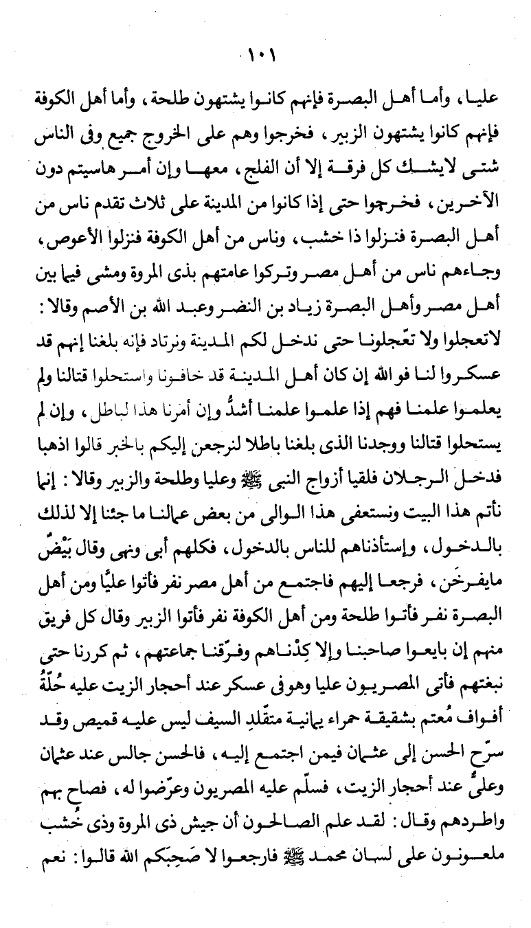 شتى لا يشك في كل فرقة إلا أن الفلج، معها وأن أمرها سيتم دون الآخرين، فخرجوا حتى إذا كانوا من المدينة على ثلاث تقدم ناس من أهل البصرة فنزلوا ذا خشب، وناس من أهل الكوفة فنزلوا الأعوص، وجاءهم ناس من أهل مصر وتركوا عامتهم بذي المرؤة ومشى فيما بين أهل مصر وأهل البصرة زياد بن النضر وعبد الله بن الأصم وقالا: لا تعجلوا ولا تعجلونا حتى ندخل لكم المدينة ونرتاد فإنه بلغنا أنهم قد عسكروا لنا فوا الله إن كان أهل المدينة قد خافونا واستحلوا قتالنا ولم يعلموا علمنا فهم إذا علموا علمنا أشد وإن أمرنا هذا لباطل، وإن لم يستحلوا قتالنا ووجدنا الذي بلغنا باطلاً لنرجعن إليكم بالخبر قالوا اذهبا فدخل الرجلان فلقيا أزواج النبي صلى الله عليه وسلم وعلياً وطلحة والزبير وقالا: إنما نأتم هذا البيت ونستعفي هذا الوالي من بعض عمالنا ما جئنا إلا لذلك بالدخول، واستأذناهم للناس بالدخول، فكلهم أبى ونهى وقال بيضُ ما يفرخن، فرجعا إليهم فاجتمع من أهل مصر نفر فأتوا علياً ومن أهل البصرة نفر فأتوا طلحة ومن أهل الكوفة نفر فأتوا الزبير وقال كل فريق منهم إن بايعوا صاحبنا وإلا كدناهم وفرقنا جماعتهم، ثم كررنا حتى نبغتهم فأتى المصريون علياً وهو عسكر عند أحجار الزيت عليه حلة أفواف معتم بشقيقة حمراء يمانية متقلد السيف ليس عليه قميص وقد سرح الحسن إلى عثمان فيمن اجتمع إليه، فالحسن جالس عند عثمان وعليّ عند أحجار الزيت، فسلم عليه المصريون وعرضوا له، فصاح بهم واطردهم وقال: لقد علم الصالحون أن جيش ذي المرؤة وذي خشب ملعونون على لسان محمد صلى الله عليه وسلم فارجعوا لا صحبكم الله قالوا: نعم