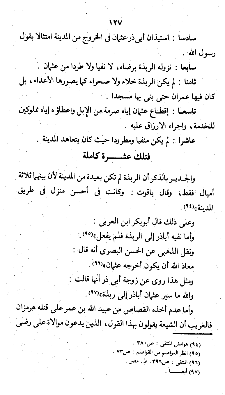 سابعًا: نزوله الربذة برضاه، لا نفيًا ولا طردًا من عثمان.