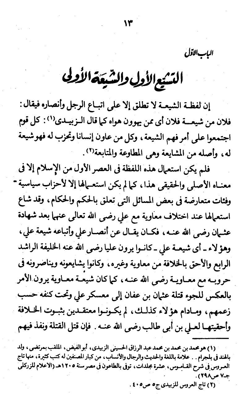 فلم يكن استعمال هذه اللفظة في العصر الأول من الإسلام إلا في معناه الأصلي والحقيقي هذا كما لم يكن استعمالها إلا لأحزاب سياسية وفئات متعارضة في بعض المسائل التي تتعلق بالحكم والحكام، وقد شاع استعمالها عند اختلاف معاوية مع علي رضي الله تعالى عنهما بعد استشهاد عثمان رضي الله عنه فكان يقال عن أنصار رضي الله عنه الخليفة الراشد الرابع والأحق بالخلافة من معاوية وغيره وكانوا يشايعونه ويناصرونه في حروبه مع معاوية رضي الله عنه كما كان شيعة معاوية يرون الأمر بالعكس للجوء قتلة عثمان بن عفان إلى معسكر علي رضي الله عنه وتحت كنفه حسب زعمهم وما دام هؤلاء كذلك لم يكونوا معتقدين بثبوت الخلافة وأحقيتها لعلي بن أبي طالب رضي الله عنه فإن قتل القتلة ونفذ فيهم