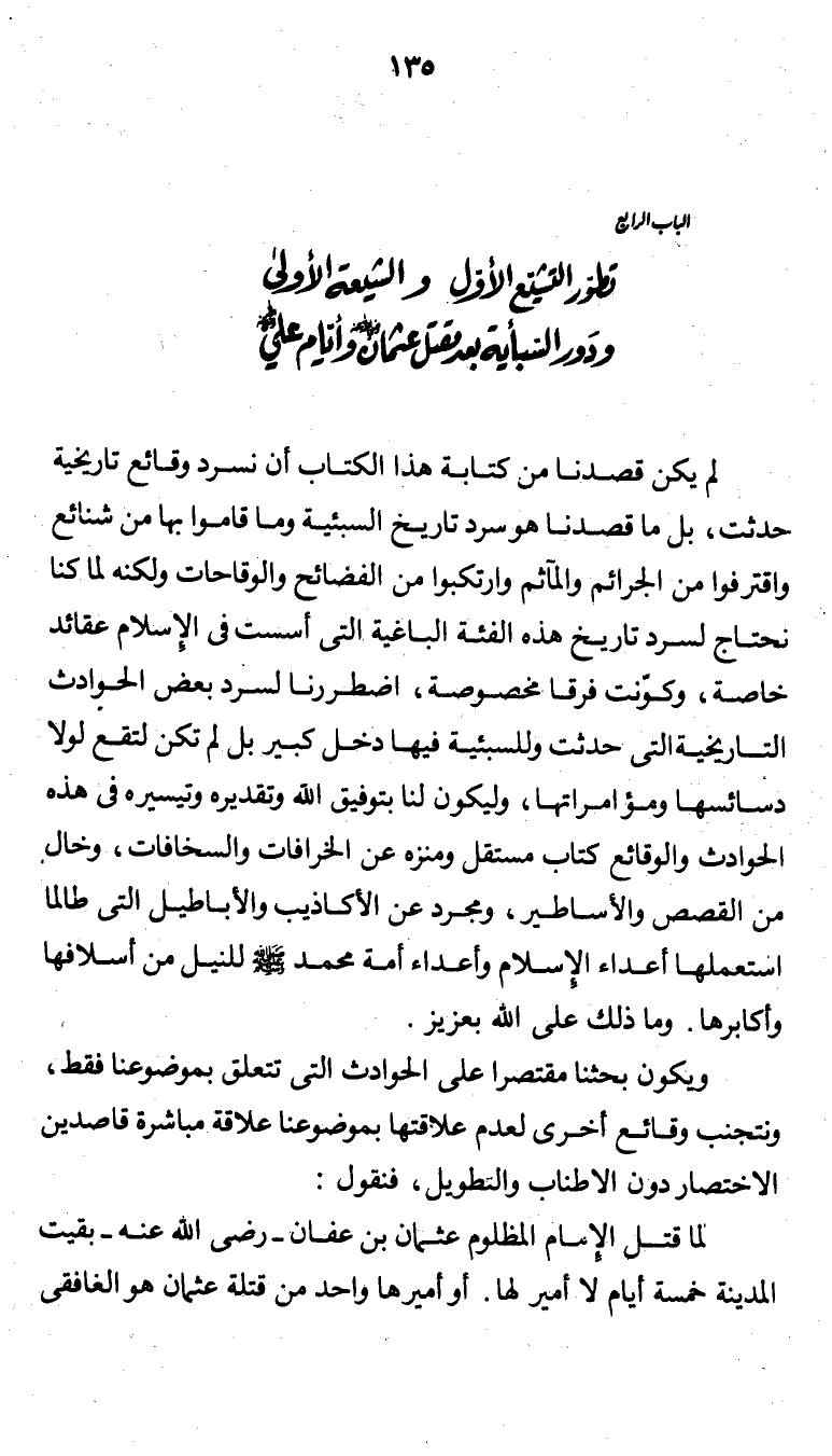 لم يكن قصدنا من كتابة هذا الكتاب أن نسرد وقائع تاريخية حدثت، بل ما قصدنا هو سرد تاريخ السبئية وما قاموا بها من شنائع واقترفوا من الجرائم والمآثم وارتكبوا من الفضائح والوقاحات ولكنه لما كنا نحتاج لسرد تاريخ هذه الفئة الباغية التي أسست في الإسلام عقائد خاصة، وكوّنت فرقًا مخصوصة، اضطررنا لسرد بعض الحوادث التاريخية التي حدثت وللسبئية فيها دخل كبير بل لم تكن لتقع لولا دسائسها ومؤامراتها، وليكون لنا بتوفيق الله وتقديره وتيسيره في هذه الحوادث والوقائع كتاب مستقل ومنزه عن الخرافات والسخافات، وخال من القصص والأساطير، ومجرد عن الأكاذيب والأباطيل التي طالما استعملها أعداء الإسلام وأعداء أمة محمد صلى الله عليه وسلم للنيل من أسلافها وأكابرها. وما ذلك على الله بعزيز.