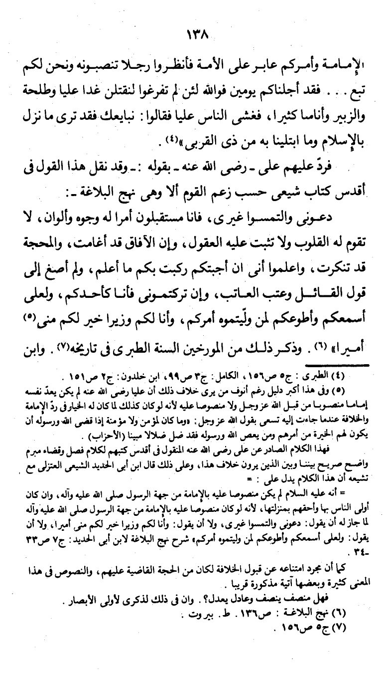 (¬2) - وفي هذا أكبر دليل رغم أنوف من يرى خلاف ذلك أن عليًّا رضي الله عنه لم يكن يعدّ نفسه إمامًا منصوبًا من قبل الله عز وجل ولا منصوصًا عليه لأنه لو كان كذلك لما كان له الخيار في ردّ الإمامة والخلافة عندما جاءت إليه تسعى بقول الله عز وجل: {وَمَا كَانَ لِمُؤْمِنٍ وَلا مُؤْمِنَةٍ إِذَا قَضَى اللَّهُ وَرَسُولُهُ أَمْرًا أَن يَكُونَ لَهُمُ الْخِيَرَةُ مِنْ أَمْرِهِمْ وَمَن يَعْصِ اللَّهَ وَرَسُولَهُ فَقَدْ ضَلَّ ضَلالاً مُّبِينًا} [الأحزاب: 36].