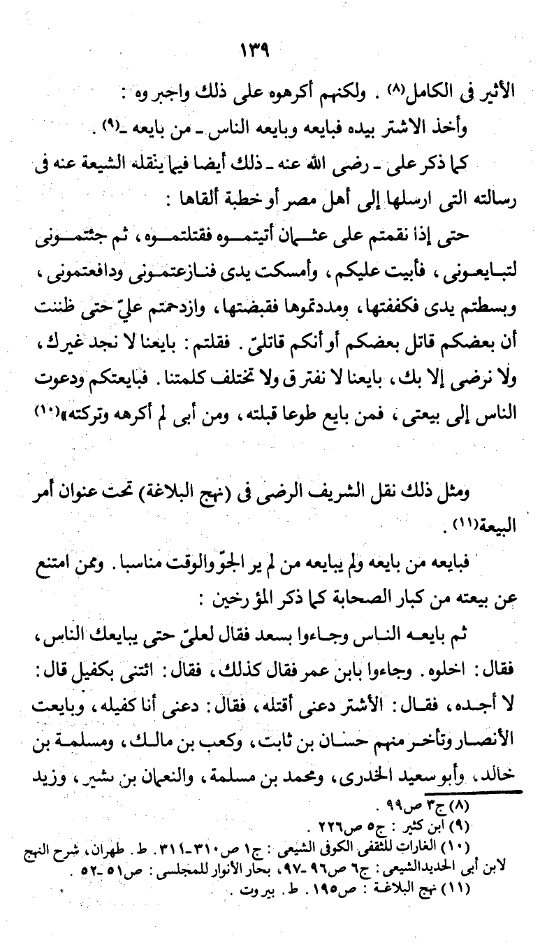 ومثل ذلك نقل الشريف الرضي في (نهج البلاغة) تحت عنوان أمر البيعة " (¬4) "