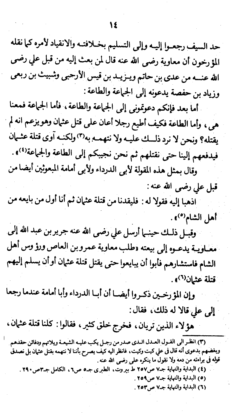 (¬1) - انظر إلى القول العدل الذي صدر من رجل يصب عليه الشيعة ويلاتهم ودفائن حقدهم وبغضهم بدعوى أنه قال في علي كيت وكيت فانظر إليه كيف يصرح بأننا لا نتهمه بقتل عثمان بل نصدق قوله في براءته من دمه ولا نقول بما ينكره علي رضي الله عنه.