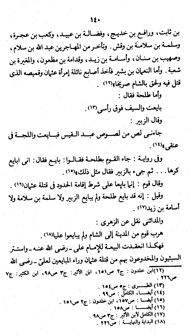 بن ثابت، ورافع بن خديج، وفضالة بن عبيد، وكعب بن عجرة، وسلمة بن سلامة بن وقش. وتأخر من المهاجرين عبد الله بن سلام، وصهيب بن سنان، وأسامة بن زيد، وقدامة بن مظعون، والمغيرة بن شعبة. وأما النعمان بن بشير فأخذ أصابع نائلة امرأة عثمان وقميصه الذي قتل فيه ولحق بالشام صريخًا" (¬1) "وأما طلحة فقال: