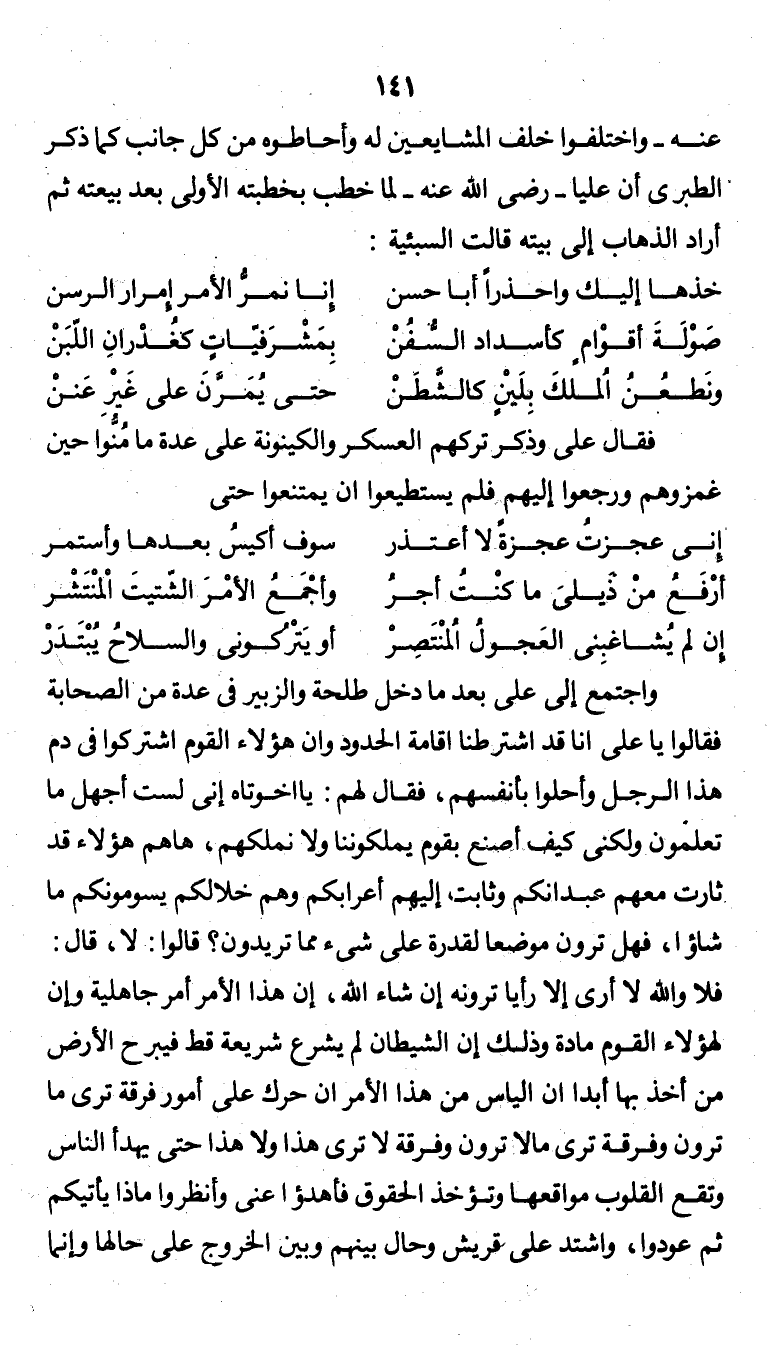 "واجتمع إلى علي بعدما دخل طلحة والزبير في عدة من الصحابة فقالوا يا علي إنا قد اشترطنا إقامة الحدود وإن هؤلاء القوم اشتركوا في دم هذا الرجل وأحلوا بأنفسهم، فقال لهم: يا أخوتاه إني لست أجهل ما تعلمون ولكني كيف أصنع بقوم يملكوننا ولا نملكهم، هاهم هؤلاء قد ثارت معهم عبدانكم وثابت إليهم أعرابكم وهم خلالكم يسومونكم ما شاءوا، فهل ترون موضعًا لقدرة على شيء مما تريدون؟ قالوا: لا، قال: فلا والله لا أرى إلا رأيًا ترونه إن شاء الله، إن هذا الأمر أمر جاهلية وإن لهؤلاء القوم مادة وذلك إن الشيطان لم يشرع شريعة قط فيبرح الأرض من أخذ بها أبدًا إن اليأس من هذا الأمر إن حرك على أمور فرقة ترى ما ترون وفرقة ترى ما لا ترون وفرقة لا ترى هذا ولا هذا حتى يهدأ الناس وتقع القلوب مواقعها وتؤخذ
