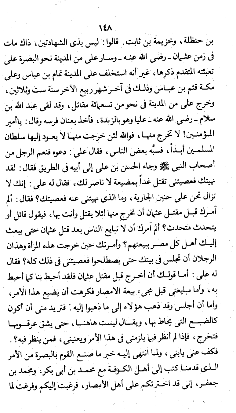 بن حنظلة، وخزيمة بن ثابت. قالوا: ليس بذي الشهادتين، ذاك مات في زمن عثمان - رضي الله عنه - وسار علي من المدينة نحو البصرة على تعبئته المتقدم ذكرها، غير أنه استخلف على المدينة تمام بن عباس وعلى مكة قثم بن عباس وذلك في آخر شهر ربيع الآخر سنة ست وثلاثين، وخرج علي من المدينة في نحو من تسعمائة مقاتل، وقد لقي عبد الله بن سلام - رضي الله عنه - عليًّا وهو بالزبدة، فأخذ بعنان فرسه وقال: يا أمير المؤمنين! لا تخرج منها، فوالله لئن خرجت منها لا يعود إليها سلطان المسلمين أبدًا، فسبَّه بعض الناس، فقال علي: دعوه فنعم الرجل من أصحاب النبي صلى الله عليه وسلم وجاء الحسن بن علي إلى أبيه في الطريق فقال: لقد نهيتك فعصيتني تقتل غدًا بمضيعة لا ناصر لك، فقال له علي: إنك لا تزال تحن على حنين الجارية، ما الذي نهيتني عنه فعصيتك؟ فقال: ألم آمرك قبل مقتل عثمان أن تخرج منها لئلا يقتل وأنت بها، فيقول قائل أو يتحدث متحدث؟ ألم آمرك أن لا تبايع الناس بعد قتل عثمان حتى يبعث إليك أهل كل مصر ببيعتهم؟ وأمرتك حين خرجت هذه المرأة وهذان الرجلان أن تجلس في بيتك حتى يصطلحوا فعصيتني في ذلك كله؟ فقال له علي: أما قولك أن أخرج قبل مقتل عثمان فلقد أحيط بنا كما أحيط به، وأما مبايعتي قبل مجيء بيعة الأمصار فكرهت أن يضيع هذا الأمر، وأما أن أجلس وقد ذهب هؤلاء إلى ما ذهبوا إليه. فتريد مني أن أكون كالضبع التي يحاط بها، ويقال ليست هاهنا، حتى يشق عرقوبها فتخرج، فإذا لم أنظر فيما يلزمني في هذا الأمر ويعنيني، فمن ينظر فيه؟. فكف عني يا بني، ولما انتهى إليه خبر ما صنع القوم بالبصرة من الأمر الذي قدمنا كتب إلى أهل الكوفة مع محمد بن أبي بكر، ومحمد بن جعفر، إني قد اخترتكم على أهل الأمصار، فرغبت إليكم وفرغت لما
