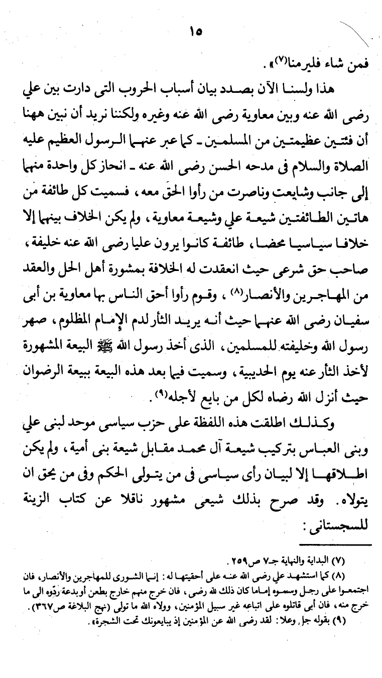 هذا ولسنا الآن بصدد بيان أسباب الحروب التي دارت بين علي رضي الله عنه وبين معاوية رضي الله عنه وغيره ولكننا نريد أن نبين هنا أن فئتين عظميتين من المسلمين ـ كما عبر عنها الرسول العظيم عليه الصلاة والسلام في مدحه الحسن رضي الله عنه ـ انحاز كل واحدة منهما إلى جانب وشايعت وناصرت من رأوا الحق معه فسميت كل طائفة من هاتين الطائفتين شيعة علي وشيعة معاوية ولم يكن الخلاف بينهما إلا خلافاً سياسياً محضاً طائفة كانوا يرون علياً رضي الله عنه خليفة صاحب حق شرعي حيث انعقدت له الخلافة بمشورة أهل الحل والعقد من المهاجرين والأنصار (¬2) وقوم رأوا أحق الناس بها معاوية بن أبي سفيان رضي الله عنهما حيث أنه يريد الثأر لدم الإمام المظلوم صهر رسول الله صلى الله عليه وسلم وخليفته للمسلمين الذي أخذ رسول الله صلى الله عليه وسلم البيعة المشهورة لأخذ الثأر عنه يوم الحديبية وسميت فيما بعد هذه البيعة بيعة الرضوان حيث أنزل الله رضاه لكل من بايع لأجله (¬3).