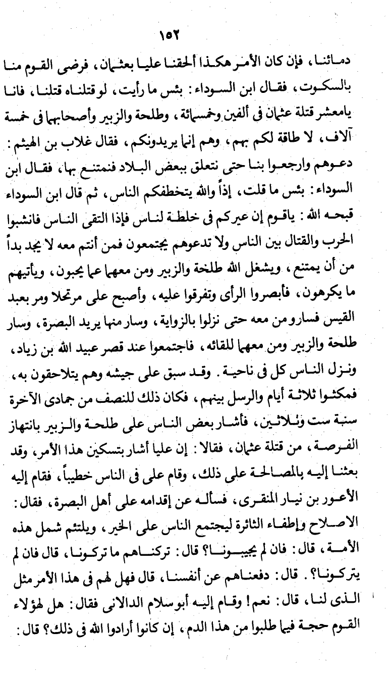 دمائنا، فإن كان الأمر هكذا أحلقنا عليًّا بعثمان، فرضي القوم منا بالسكوت، فقال ابن السوداء: بئس ما رأيت، لو قتلناه قتلنا، فإنا يا معشر قتلة عثمان في ألفين وخمسمائة، وطلحة والزبير وأصحابهما في خمسة آلاف، لا طاقة لكم بهم، وهم إنما يريدونكم، فقال غلاب بن الهيثم: دعوهم وارجعوا بنا حتى نتعلق ببعض البلاد فنمتنع بها، فقال ابن السوداء: بئس ما قلت، إذًا والله يتخطفكم الناس، ثم قال ابن السوداء قبحه الله: يا قوم إن عيركم في خلطة لناس فإذا اتقى الناس فانشبوا الحرب والقتال بين الناس ولا تدعوهم يجتمعون فمن أنتم معه لا يجد بدًّا من أن يمتنع، ويشغل الله طلحة والزبير ومن معهما عما يحبون، ويأتيهم ما يكرهون، فأبصروا الرأي وتفرقوا عليه، وأصبح علي مرتحلاً ومر بعبد القيس فسار ومن معه حتى نزلوا بالزاوية، وسار منها يريد البصرة، وسار طلحة والزبير ومن معهما للقائه، فاجتمعوا عند قصر عبيد الله بن زياد، ونزل الناس كل في ناحية. وقد سبق علي جيشه وهم يتلاحقون به، فمكثوا ثلاثة أيام والرسل بينهم، فكان ذلك للنصف من جمادى الآخرة سنة ست وثلاثين، فأشار بعض الناس على طلحة والزبير بانتهاز الفرصة، من قتلة عثمان، فقالا: إن عليًّا أشار بتسكين هذا الأمر، وقد بعثنا إليه بالمصالحة على ذلك، وقام علي في الناس خطيبًا، فقام إليه الأعور بن