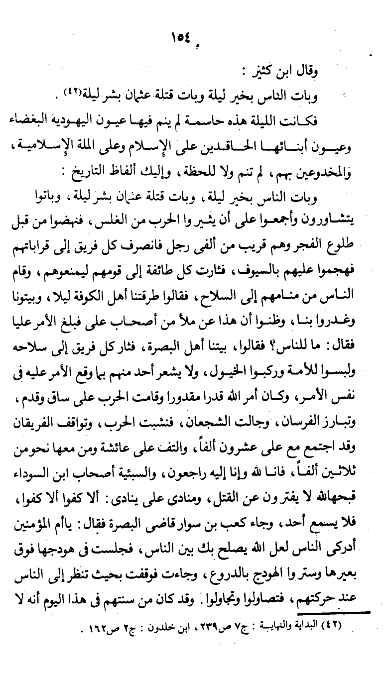 "وبات الناس بخير ليلة، وبات قتلة عثمان بشر ليلة، وباتوا يتشاورون وأجمعوا على أن يثيروا الحرب من الغلس، فنهضوا من قبل طلوع الفجر وهم قريب من ألفي رجل فانصرف كل فريق إلى قراباتهم فهجموا عليهم بالسيوف، فثارت كل طائفة إلى قومهم يمنعوهم، وقام الناس من منامهم إلى السلاح، فقالوا طرقتنا أهل الكوفة ليلاً، وبيّتونا وغدروا بنا، وظنوا أن هذا عن ملأ من أصحاب عليّ فبلغ الأمر عليًّا فقال: ما للناس؟ فقالوا، بيتنا أهل البصرة، فثار كل فريق إلى سلاحه ولبسوا للأمة وركبوا الخيول، ولا يشعر أحد منهم بما وقع الأمر عليه في نفس الأمر، وكان أمر الله قدرًا مقدورًا وقامت الحرب على ساق وقدم، وتبارز الفرسان، وجالت الشجعان، فنشبت الحرب، وتواقف الفريقان وقد اجتمع مع علي عشرون ألفًا، والتف على عائشة ومن معها نحو من ثلاثين ألفًا، فإنا لله وإنا إليه راجعون، والسبئية أصحاب ابن السوداء قبحها الله لا يفترون عن القتل، ومنادي علي ينادي: ألا كفوا ألا كفوا، فلا يسمع أحد، وجاء كعب بن سوار قاضي البصرة فقال: يا أم المؤمنين أدركي الناس لعل الله يصلح بك بين الناس، فجلست في هودجها فوق بعيرها وستروا الهودج بالدروع، وجاءت فوقفت بحيث تنظر إلى الناس عند حركتهم، فتصاولوا وتجاولوا. وقد كان من سنتهم في هذا اليوم أنه لا