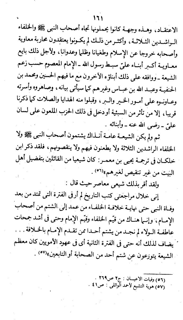 ثم ولم يكن الشيعة عامة آنذاك يشتمون أصحاب النبي صلى الله عليه وسلم ولا الخلفاء الراشدين الثلاثة ولا يطعنون فيهم ولا ينقصونهم، فلقد ذكر ابن خلكان في ترجمة يحيى بن معمر: كان شيعيًّا من القائلين بتفضيل أهل البيت من غير تنقيص لغيرهم" (¬1) ".