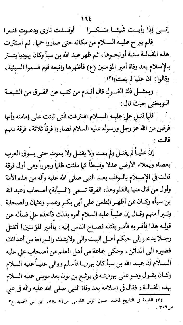 إن عليًّا لم يقتل ولم يمت ولا يقتل ولا يموت حتى يسوق العرب بعصاه ويملأ الأرض عدلاً وقسطًا كما ملئت ظلمًا وجورًا وهي أول فرقة قالت في الإسلام بالوقف بعد النبي صلى الله عليه وسلم من هذه الأمة وأول من قال منها بالغلو وهذه الفرقة تسمى (السبأية) أصحاب "عبد الله بن سبأ" وكان ممن أظهر الطعن على أبي بكر وعمر وعثمان والصحابة وتبرأ منهم وقال إن عليًّا عليه السلام أمره بذلك فأخذه عليّ فسأله عن قوله هذا فأقر به فأمر بقتله فصاح الناس إليه: يا أمير المؤمنين! أتقتل رجلاً يدعو إلى حبكم أهل البيت وإلى ولايتك والبراءة من أعدائك فصيره إلى المدائن، وحكى جماعة من أهل العلم من أصحاب علي عليه السلام أن عبد الله بن سبأ كان يهوديًّا فأسلم ووالى عليًّا عليه السلام وكان يقول وهو على يهوديته في يوشع بن نون بعد موسى عليه السلام بهذه المقالة، فقال في إسلامه بعد وفاة النبي صلى الله عليه وسلم في علي