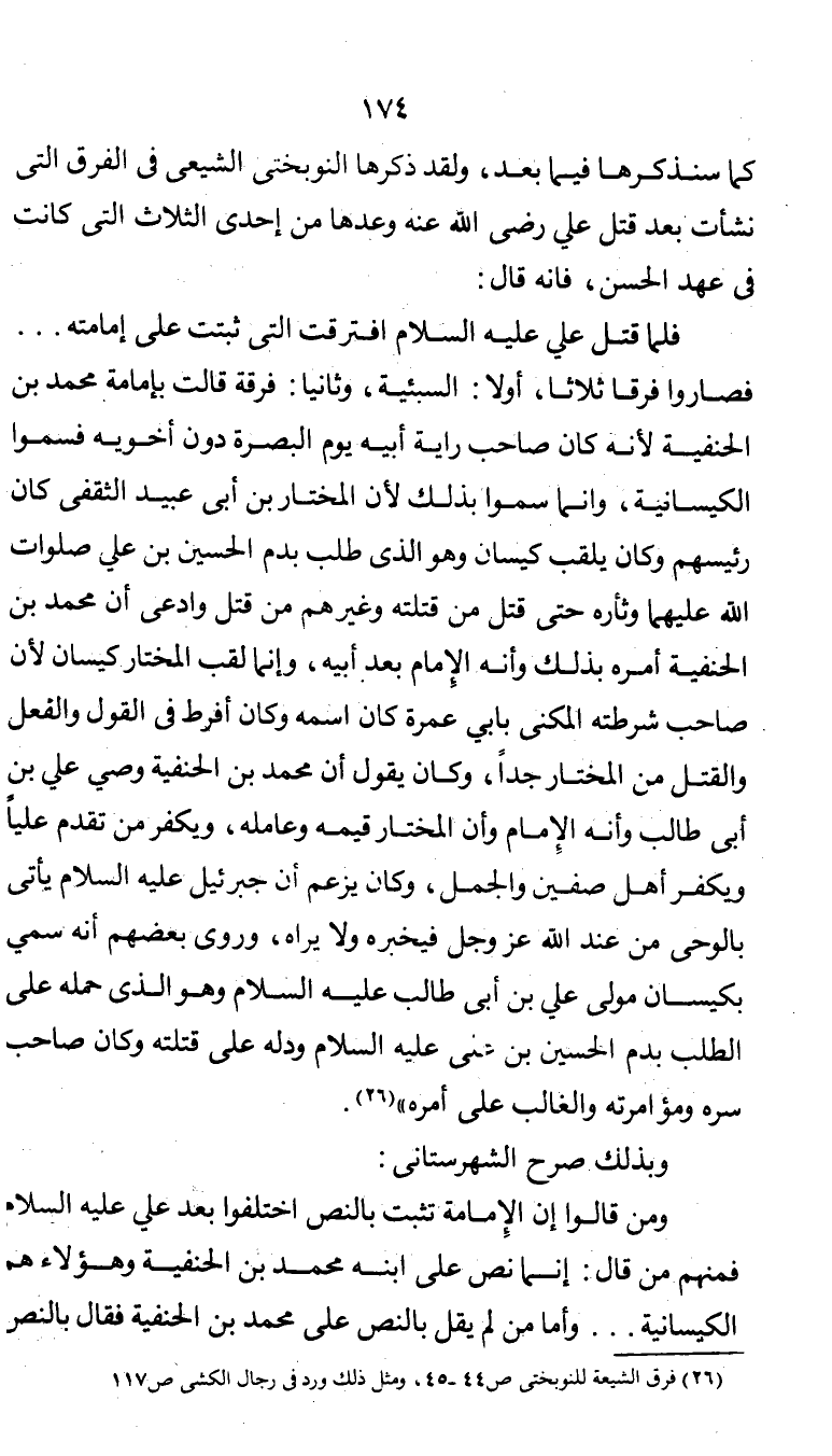 ومن قالوا إن الإمام تثبت بالنص اختلفوا بعد علي عليه السلام فمنهم من قال: إنما نص على ابنه محمد بن الحنفية وهؤلاء هم الكيسانية ... وأما من لم يقل بالنص على محمد بن الحنفية فقال بالنص