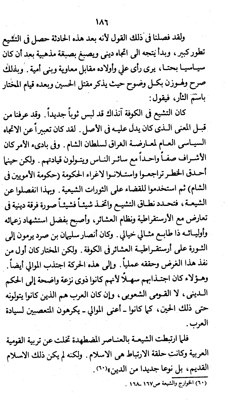 "كان التشيع في الكوفة آنذاك قد لبس ثوبًا جديدًا. وقد عرفنا من قبل المعنى الذي كان يدل عليه في الأصل. لقد كان تعبيرًا عن الاتجاه السياسي العام لمعارضة العراق لسلطان الشام. وفي بادئ الأمر كان الأشراف صفًّا واحدًا مع سائر الناس ويتولون قيادتهم. ولكن حينما أحدث الخطر تراجعوا واستلانوا لإغراء الحكومة (حكومة الأمويين في الشام) ثم استخدموا للقضاء على الثورات الشيعية. وبهذا انفصلوا عن الشيعة، فتحدد نطاق التشيع واتخذ شيئًا فشيئًا صورة فرقة دينية في تعارض مع الأرستقراطية ونظام العشائر، وأصبح بفضل استشهاد زعمائه وأوليائه ذا طابع مثالي خيالي. وكان أنصار سليمان بن صرد يرمون إلى الثورة على أرستقراطية العشائر في الكوفة. ولكن المختار كان أول من نفذ هذا الغرض وحققه عمليًّا. وإلى هذه الحركة اجتذب الموالي أيضًا. وهؤلاء كان اجتذابهم سهلاً لأنهم كانوا ذوي نزعة واضحة إلى الحكم الديني، لا القومي الشعوبي، وإن كان العرب هم الذين كانوا يتولونه حتى ذلك الحين، كما كانوا - أعني الموالي - يكرهون المتعصبين لسيادة العرب.