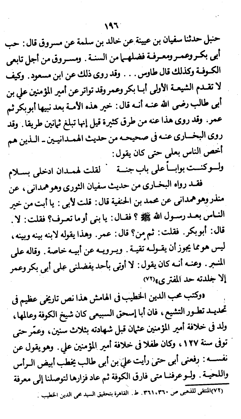 "وكتب محب الدين الخطيب في الهامش هذا نص تاريخي عظيم في تحديد تطور التشيع، فإن أبا إسحاق السبيعي كان شيخ الكوفة وعالمها، ولد في خلافة أمير المؤمنين عثمان قبل شهادته بثلاث سنين، وعمّر حتى توفي سنة 127، وكان طفلاً في خلافة أمير المؤمنين علي. وهو يقول عن نفسه: رفعني أبي حتى رأيت علي بن