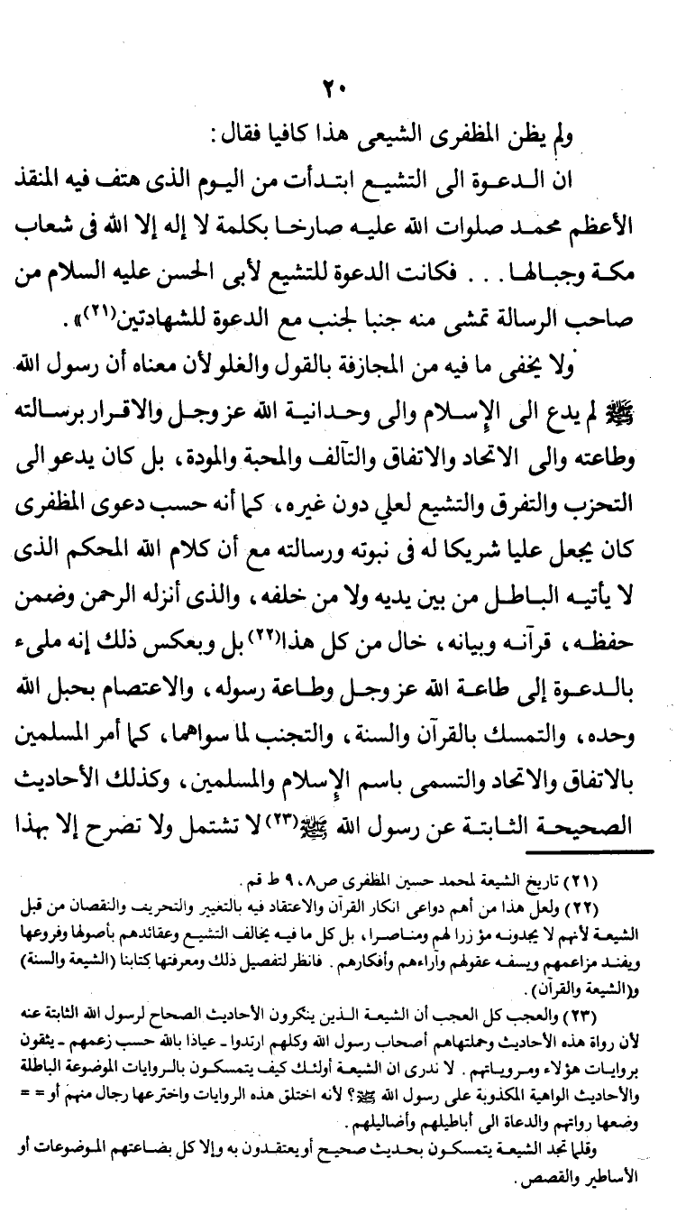 ولا يخفى ما فيه من المجازفة بالقول والغلو لأن معناه أن رسول الله صلى الله عليه وسلم لم يدع إلى الإسلام وإلى وحدانية الله عز وجل والإقرار برسالته وطاعته وإلى الاتحاد والاتفاق والتآلف والمحبة والمودة بل كان يدعو إلى التحزب والتفرق والتشيع لعلي دون غيره كما أنه حسب دعوى المظفري كان يجعل علياً شريكاً له في نبوته ورسالته مع أن كلام الله المحكم الذي لا يأتيه الباطل من بين يديه ولا من خلفه والذي أنزله الرحمن وضمن حفظه قرآنه وبيانه خال من كل هذا (¬2) بل ويعكس ذلك أنه مليء بالدعوة إلى طاعة الله عز وجل وطاعة رسوله صلى الله عليه وسلم والاعتصام بحبل الله وحده والتمسك بالقرآن والسنة والتجنب لما سواهما كما أمر المسلمين بالاتفاق والاتحاد والتسمي باسم الإسلام والمسلمين وكذلك الأحاديث الصحيحة الثابتة عن رسول الله صلى الله عليه وسلم (¬3) لا تشتمل ولا تصرح إلا بهذا