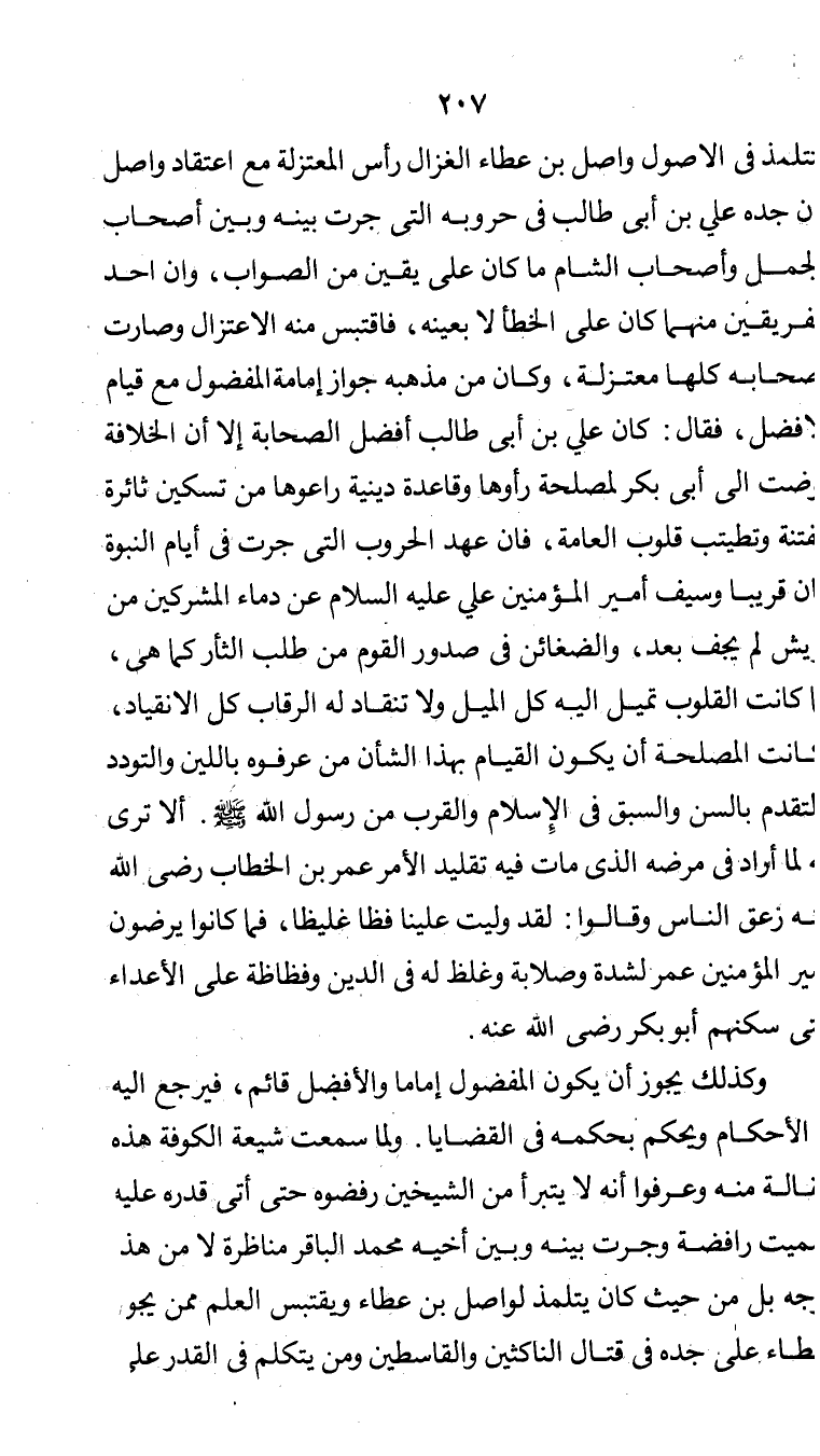 وكذلك يجوز أن يكون المفضول إماماً والأفضل قائم، فيرجع إليه في الأحكام، ويحكم بحكمه في القضايا. ولما سمعت شيعة أهل الكوفة هذه المقالة منه، وعرفوا أنه لا يتبرأ من الشيخين، رفضوه، حتى أتى قدره عليه، فسميت رافضة. وجرت بينه وبين أخيه محمد الباقر مناظرة لا من هذا الوجه، بل من حيث كان يتلمذ لواصل بن عطاء، ويقتبس العلم ممن يجوّز الخطاء على جده في قتال الناكثين والقاسطين، ومن يتكلم في القدر على