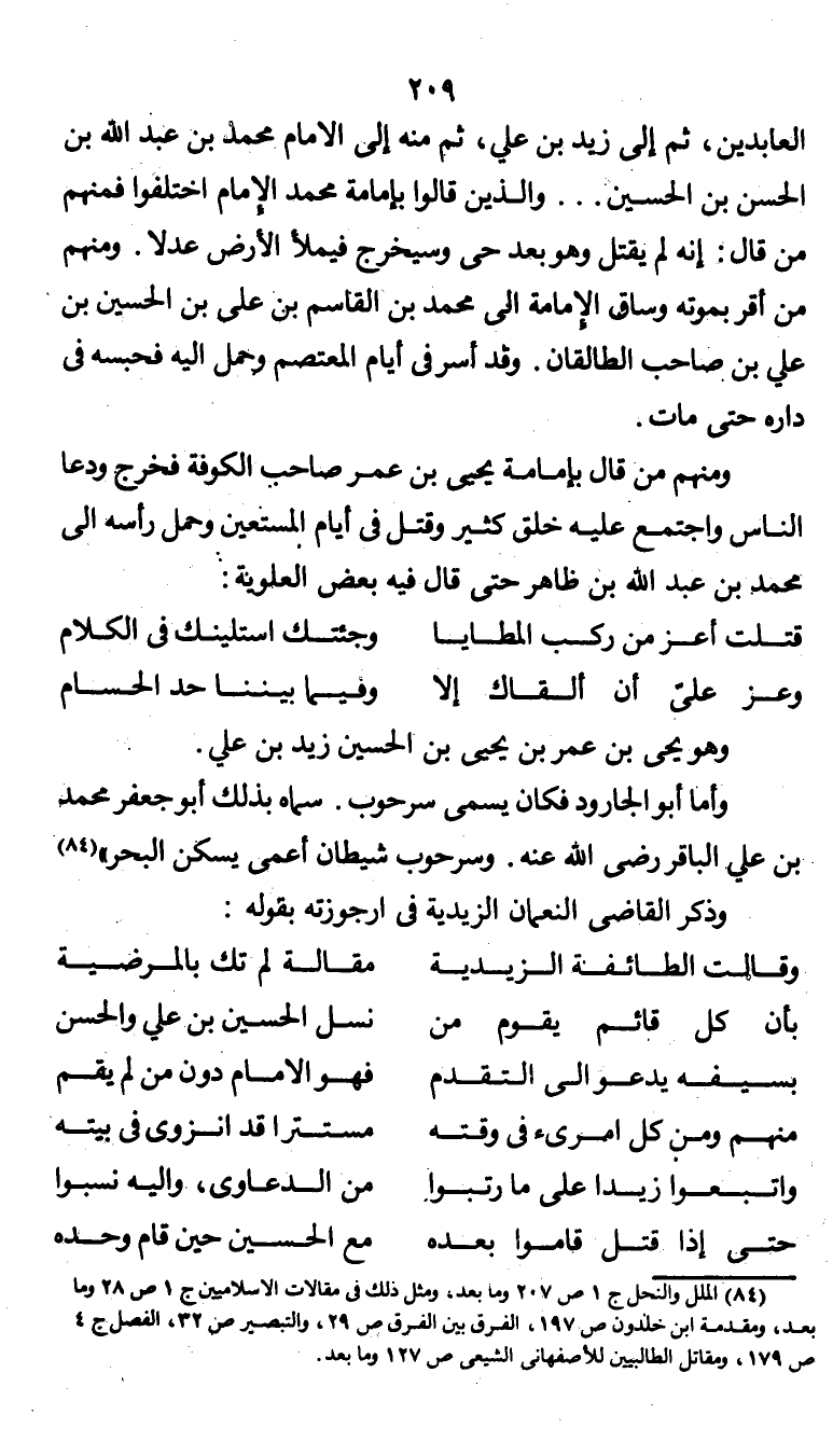 العابدين، ثم إلى زيد بن علي، ثم منه إلى الإمام محمد بن عبد الله بن الحسن بن الحسين ... والذين قالوا بإمامة محمد الإمام إختلفوا، فمنهم من قال: إنه لم يُقتل وهو بعد حي، وسيخرج فيملأ الأرض عدلاً، ومنهم من أقر بموته وساق الإمامة إلى محمد بن القاسم بن علي بن الحسين بن علي بن صاحب الطالقان. وقد أسر في أيام المعتصم، وحُمل إليه، فحبسه في داره حتى مات.