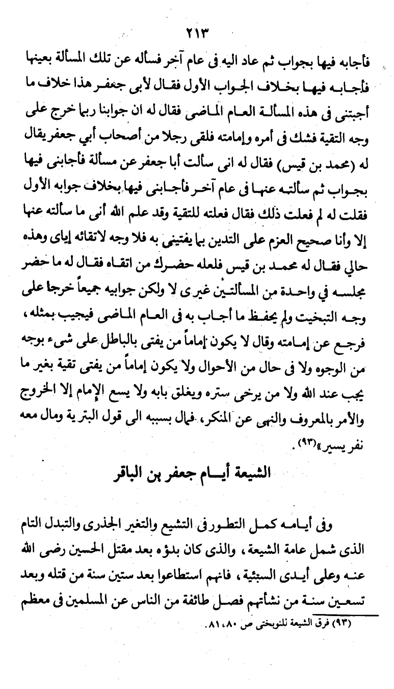 فلقي رجلاً من أصحاب أبي جعفر ُيقال له (محمد بن قيس) فقال له: إني سألت أبا جعفر عن مسألة فأجابني فيها بجواب، ثم سألته عنها في عام آخر فأجابني فيها بخلاف جوابه الأول، فقلت له لم فعلت ذلك فقال فعلته للتقية، وقد علم الله أني ما سألته عنها إلا وأنا صحيح العزم على التدين بما يفتيني به، فلا وجه لاتقائه إياي وهذه حالي. فقال له محمد بن قيس: فلعله حضرك من اتقاه. فقال له: ما حضر
