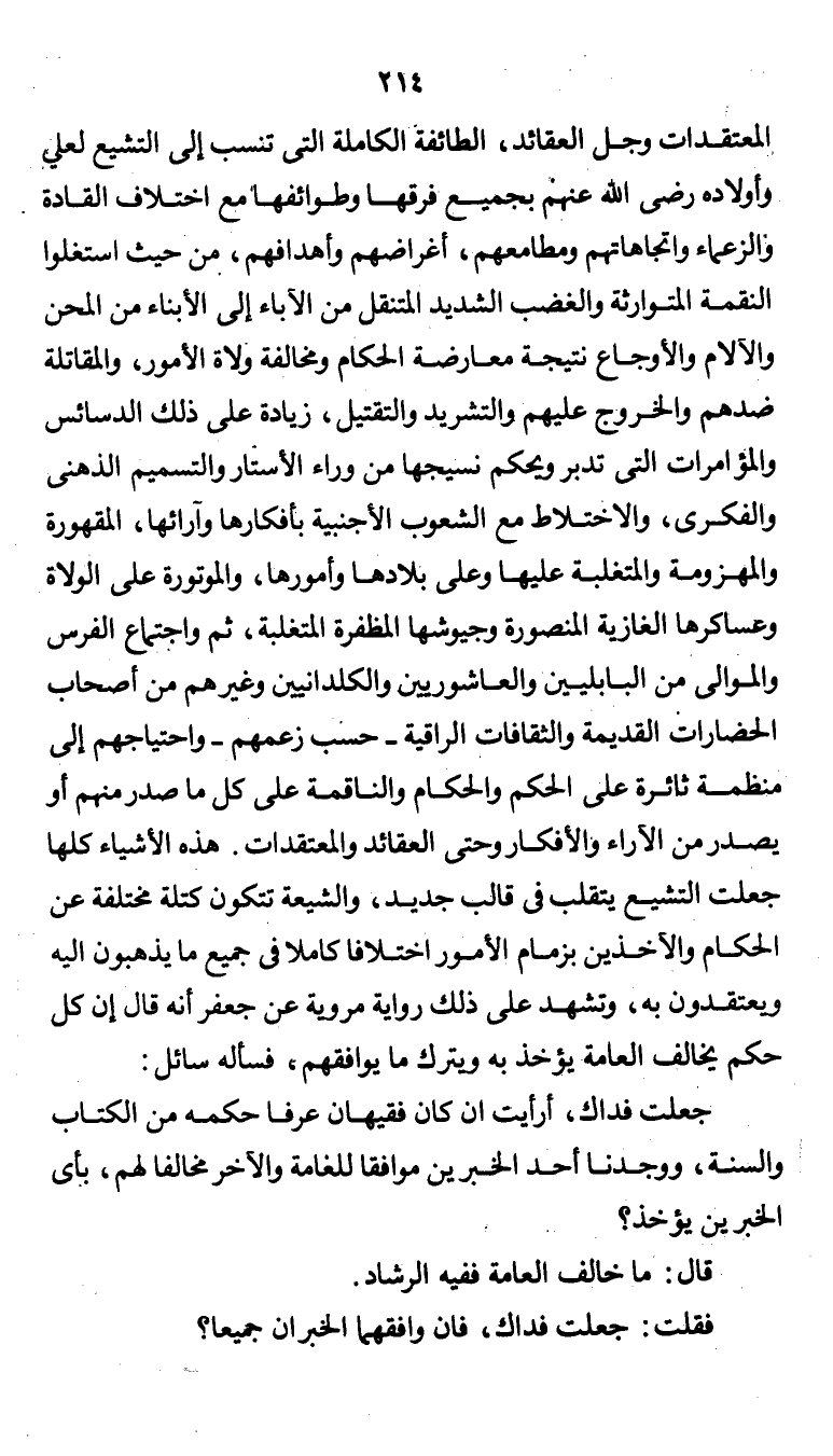 المعتقدات وجل العقائد. الطائفة الكاملة التي تنسب إلى التشيع لعلي وأولاده رضي الله عنهم بجميع فرقها وطوائفها مع اختلاف القادة والزعماء واتجاهاتهم ومطامعهم، أغراضهم وأهدافهم، من حيث استغلوا النقمة المتوارثة والغضب الشديد المتنقل من الآباء إلى الأبناء من المحن والآلام والأوجاع نتيجة معارضة الحكام ومخالفة ولاة الأمور، والمقاتلة ضدهم والخروج عليهم والتشريد والتقتيل، زيادة على ذلك الدسائس والمؤامرات التي تدبر ويحكم نسيجها من وراء الأستار والتسميم الذهني والفكري، والاختلاط مع الشعوب الأجنبية بأفكارها وآرائها، المقهورة والمهزومة والمتغلب عليها وعلى بلادها وأمورها، والموتورة على الولاة وعساكرها الغازية المنصورة وجيوشها المظفرة المتغلبة، ثم واجتماع الفرس والموالي من البابليين والعاشوريين والكلدانيين وغيرهم من أصحاب الحضارات القديمة والثقافات الراقية - حسب زعمهم - واحتياجهم إلى منظمة ثائرة على الحكم والحكام، والناقمة على كل ما صدر منهم أو يصدر من الآراء والأفكار وحتى العقائد والمعتقدات.