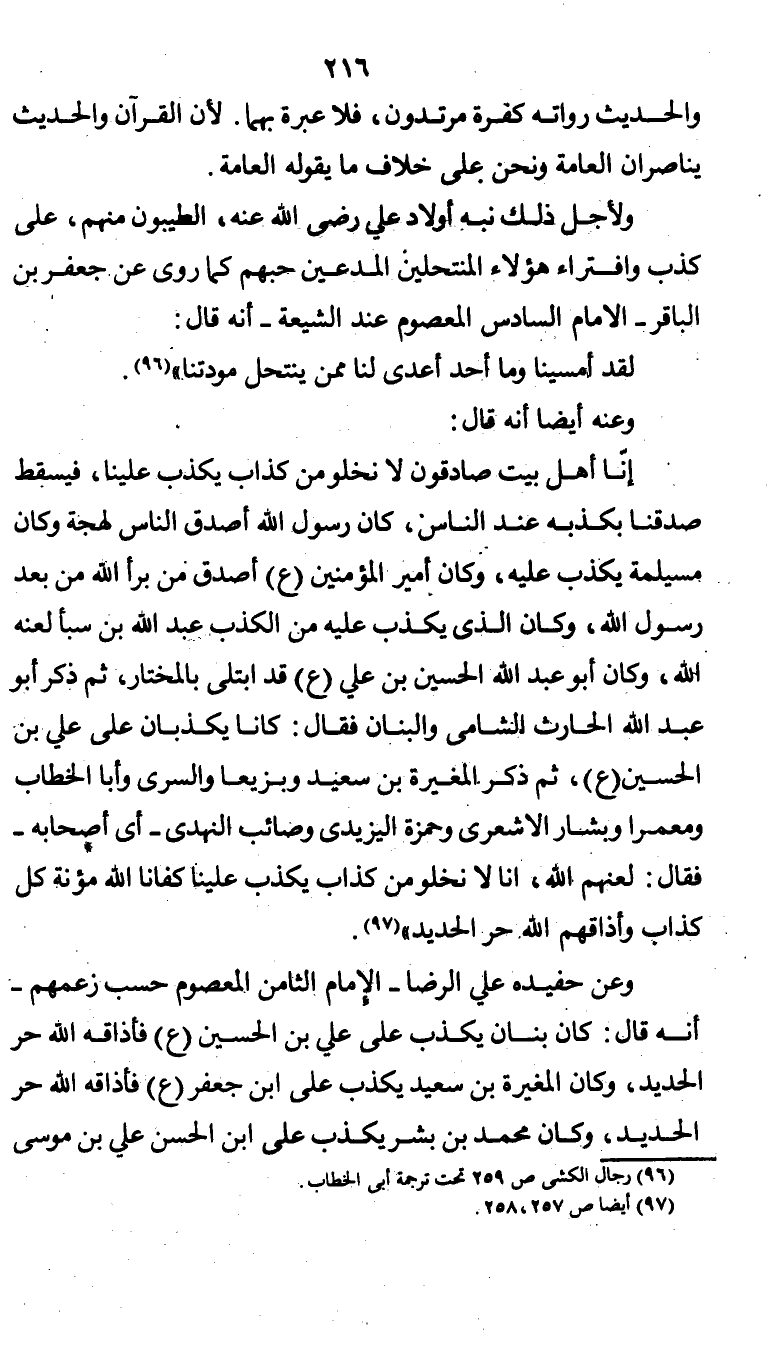 وعن حفيده علي الرضا - الإمام الثامن المعصوم حسب زعمهم - أنه قال: كان بنان يكذب على علي بن الحسين (ع) فأذاقه الله حر الحديد، وكان المغيرة بن سعيد يكذب على إبن جعفر (ع) فأذاقه الله حر الحديد، وكان محمد بن بشر يكذب على إبن الحسن علي بن موسى