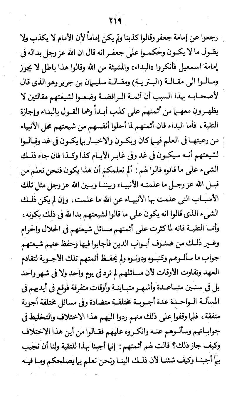 وأما التقية، فإنه لما كثرت على أئمتهم مسائل شيعتهم في الحلال والحرام وغير ذلك من صنوف أبواب الدين، فأجابوا فيها، وحفظ عنهم شيعتهم جواب ما سألوهم وكتبوه ودونوه، ولم يحفظ أئمتهم تلك الأجوبة لتقادم العهد، وتفاوت الأوقات، لأن مسائلهم لم ترد في يوم واحد ولا في شهر واحد، بل في سنين متباعدة، وأشهر متباينة، وأوقات متفرقة. فوقع في أيديهم في المسألة الواحدة عدة أجوبة مختلفة متضادة، وفي مسائل مختلفة أجوبة متفقة. فلما وقفوا على ذلك منهم، ردوا إليهم هذا الإختلاف والتخليط في جواباتهم، وسألوهم عنه، وأنكروا عليهم فقالوا: من أين هذا الإختلاف؟ وكيف جاز ذلك؟ قالت لهم أئمتهم: إنما أجبنا بهذا للتقية، ولنا أن نجيب بما أجبنا، وكيف شئنا، لأن ذلك إلينا، ونحن نعلم بما يصلحكم وما فيه