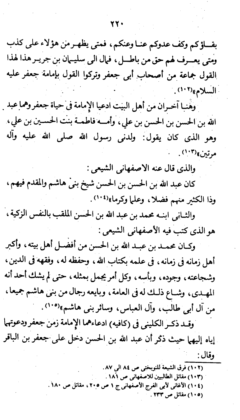 وقد ذكر الكليني في (كافيه) إدعاءهما الإمامة زمن جعفر ودعوتهما إياه إليهما، حيث ذكر أن عبد الله بن الحسن دخل على جعفر بن الباقر وقال:
