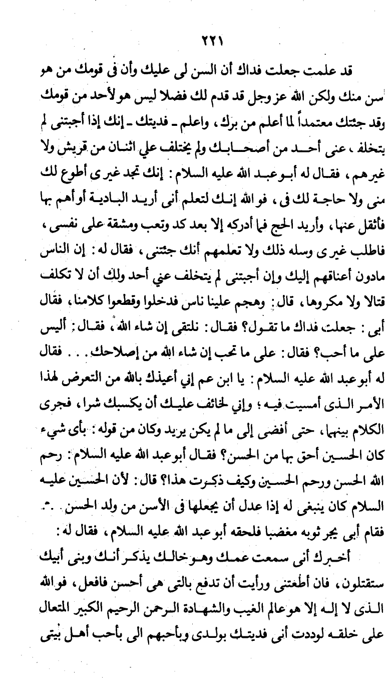 " قد علمت جُعلت فداك أن السن لي عليك، وأن في قومك من هو أسن منك، ولكن الله عز وجل قد قدم لك فضلاً ليس هو لأحد من قومك، وقد جئتك معتمداً لما أعلم من برّك، واعلم - فديتك - إنك إذا أجبتني لم يتخلف عني أحد من أصحابك، ولم يختلف علي إثنان من قريش ولا غيرهم. فقال له أبو عبد الله عليه السلام: إنك تجد غيري أطوع لك مني ولا حاجة لك فيّ، فوالله إنك لتعلم أني أريد البادية أو أهم بها فأثقل عنها، وأريد الحج فما أدركه إلا بعد كد وتعب ومشقة على نفسي، فاطلب غيري وسله ذلك ولا تعلمهم أنك جئتني. فقال له: إن الناس مادون أعناقهم إليك، وإن أجبتني لم يتخلف عني أحد، ولك أن لا تكلف قتالاً ولا مكروهاً. قال: وهجم علينا ناس فدخلوا وقطعوا كلامنا، فقال أبي: جعلت فداك ما تقول؟. فقال: نلتقي إن شاء الله. فقال: أليس على ما أحب؟. فقال: على ما تحب إن شاء الله من إصلاحك ... فقال له أبوعبد الله عليه السلام: يا ابن عم، إني أعيذك بالله من التعرض لهذا الأمر الذي أمسيت فيه، وإني لخائف عليك أن يكسبك شرا. فجرى الكلام بينهما، حتى أفضى إلى ما لم يكن يريد. وكان من قوله: بأي شيئ كان الحسين أحق بها من الحسن؟ فقال أبو عبد الله عليه السلام: رحم الله الحسن، ورحم الحسين، وكيف ذكرت هذا؟ قال: لأن الحسين عليه السلام، كان ينبغي له إذا عدل أن يجعلها في الأسن من ولد الحسن ... فقام أبي يجر ثوبه مغضباً، فلحقه أبو عبد الله عليه السلام، فقال له: أخبرك أني سمعت عمك وهو خالك يذكر أنك وبني أبيك ستقتلون، فإن أطعتني ورأيت أن تدفع بالتي هي أحسن فافعل، فوالله الذي لا إله إلا هو عالم الغيب والشهادة الرحمن الرحيم الكبير المتعال على خلقه، لوددت أني فديتك بولدي وبأحبهم إلي بأحب أهل بيتي