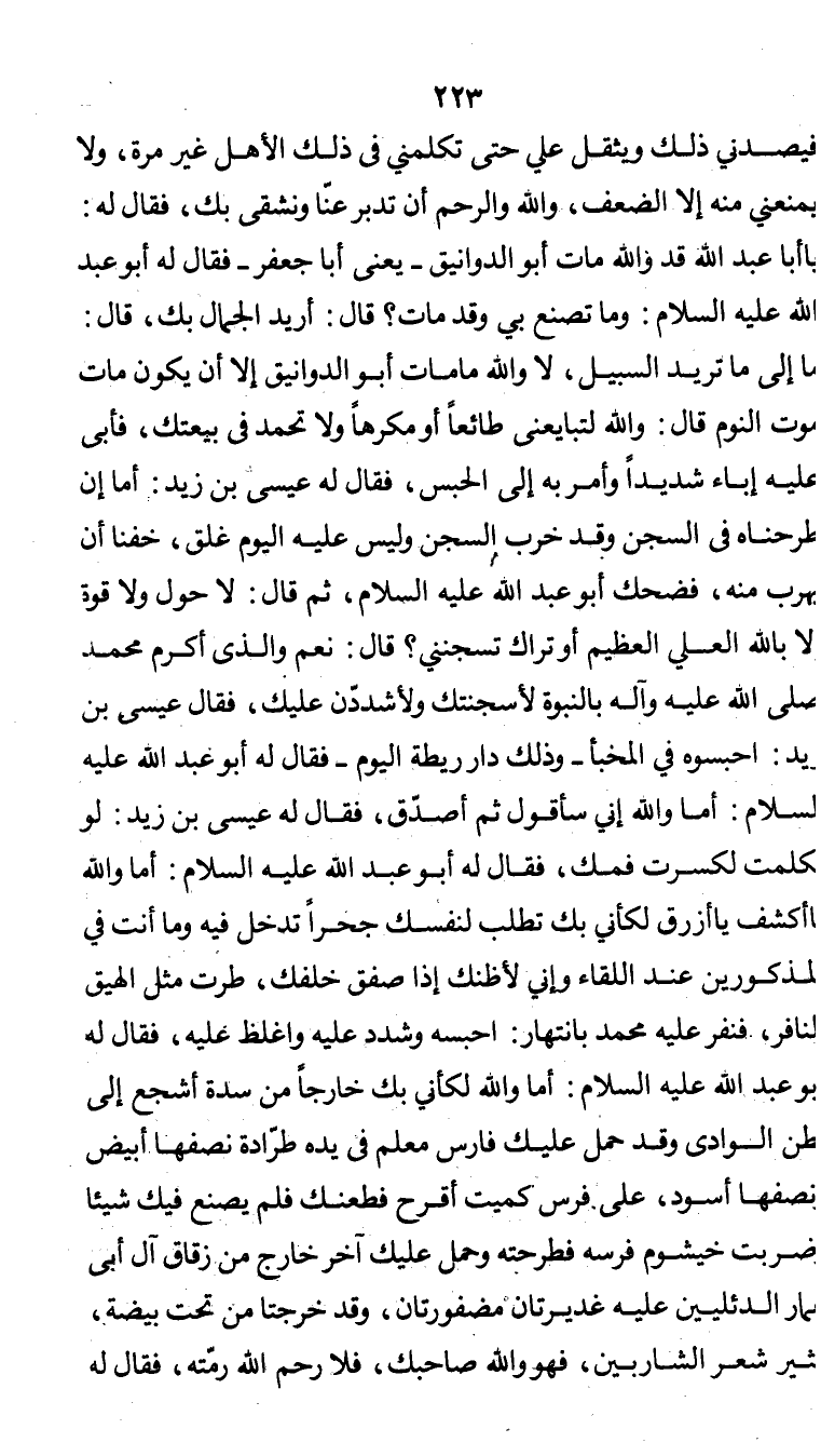 الضعف، والله والرحم أن تدبر عنّا ونشقى بك. فقال له: يا أبا عبد الله قد والله مات أبو الدوانيق - يعني أبا جعفر - فقال له أبو عبد الله عليه السلام: وما تصنع بي وقد مات؟ قال: أريد الحمال بك، قال: ما إلى ما تريد السبيل، لا والله ما مات أبو الدوانيق إلا أن يكون مات موت النوم. قال: والله لتبايعني طائعا ً أو مكرها ولا تحمد في بيعتك. فأبى عليه إباء شديداً، وأمر به إلى الحبس. فقال له عيسى بن زيد: أما إن طرحناه في السجن وقد خرب السجن وليس عليه اليوم غلق، خفنا أن يهرب منه. فضحك أبو عبد الله عليه السلام، ثم قال: لا حول ولا قوة إلا بالله العلي العظيم، أوتراك تسجنني؟ قال: نعم والذي أكرم محمد صلى الله عليه وآله بالنبوة، لأسجننك ولأشددّن عليك. فقال عيسى بن زيد: إحبسوه في المخبأ - وذلك دار ريطة اليوم - فقال له أبو عبد الله عليه السلام: أما والله إني سأقول ثم أصدق. فقال له عيسى بن زيد: لو تكلمت لكسرت فمك. فقال له أبوعبد الله عليه السلام: أما والله يا أكشف يا أزرق، لكأني بك تطلب لنفسك جحراً تدخل فيه، وما أنت في المذكورين عند اللقاء، وإني لأظنك إذا صفق خلفك، طرت مثل الهيق النافر. فنفر عليه محمد بانتهار: إحبسه وشدد عليه وأغلظ عليه. فقال له أبو عبد الله عليه السلام: أما والله لكأني بك خارجاً من سدة أشجع إلى بطن الوادي وقد حمل عليك فارس معلم في يده طرّادة نصفها أبيض ونصفها أسود، على فرس كميت أقرح، فطعنك فلم يصنع فيك شيئاً وضربت خيشوم فرسه فطرحته، وحمل عليك آخر خارج من زقاق آل أبي عمار الدئليين عليه غديرتان مضفورتان، وقد خرجتا من تحت بيضة، كثير شعر الشاربين، فهو والله صاحبه، فلا رحم الله رمته. فقال له محمد: