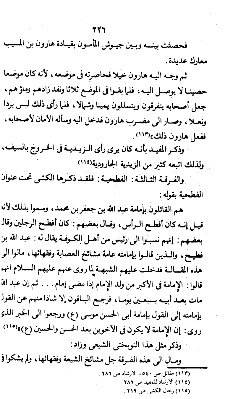 " هم القائلون بإمامة عبد الله بن جعفر بن محمد، وسموا بذلك لأنه قيل أنه كان أفطح الرأس، وقال بعضهم: كان أفطح الرجلين، وقال بعضهم: إنهم نسبوا إلى رئيس من أهل الكوفة يقال له: عبد الله بن فطيح، والذين قالوا بإمامته عامة مشائخ العصابة وفقهائها، مالوا إلى هذه المقالة فدخلت عليهم الشبهة لما روى عنهم عليهم السلام أنهم قالوا: الإمامة في الأكبر من ولد الإمام إذا مضى إمام ... ثم إن عبد الله مات بعد أبيه بسبعين يوما، فرجع الباقون إلا شاذا منهم عن القول بإمامته إلى القول بإمامة أبي الحسن (ع) ورجعوا إلى الخبر الذي روى: إن الإمامة لا يكون في الآخوين بعد الحسن والحسين (ع) " (¬3).