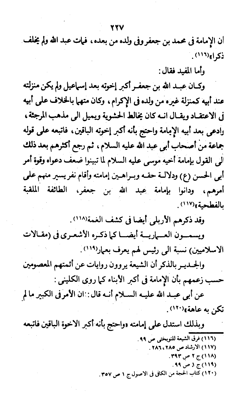 أن الإمامة في محمد بن جعفر وفي ولده من بعده، فمات عبد الله ولم يخلف ذكرا " (¬1).