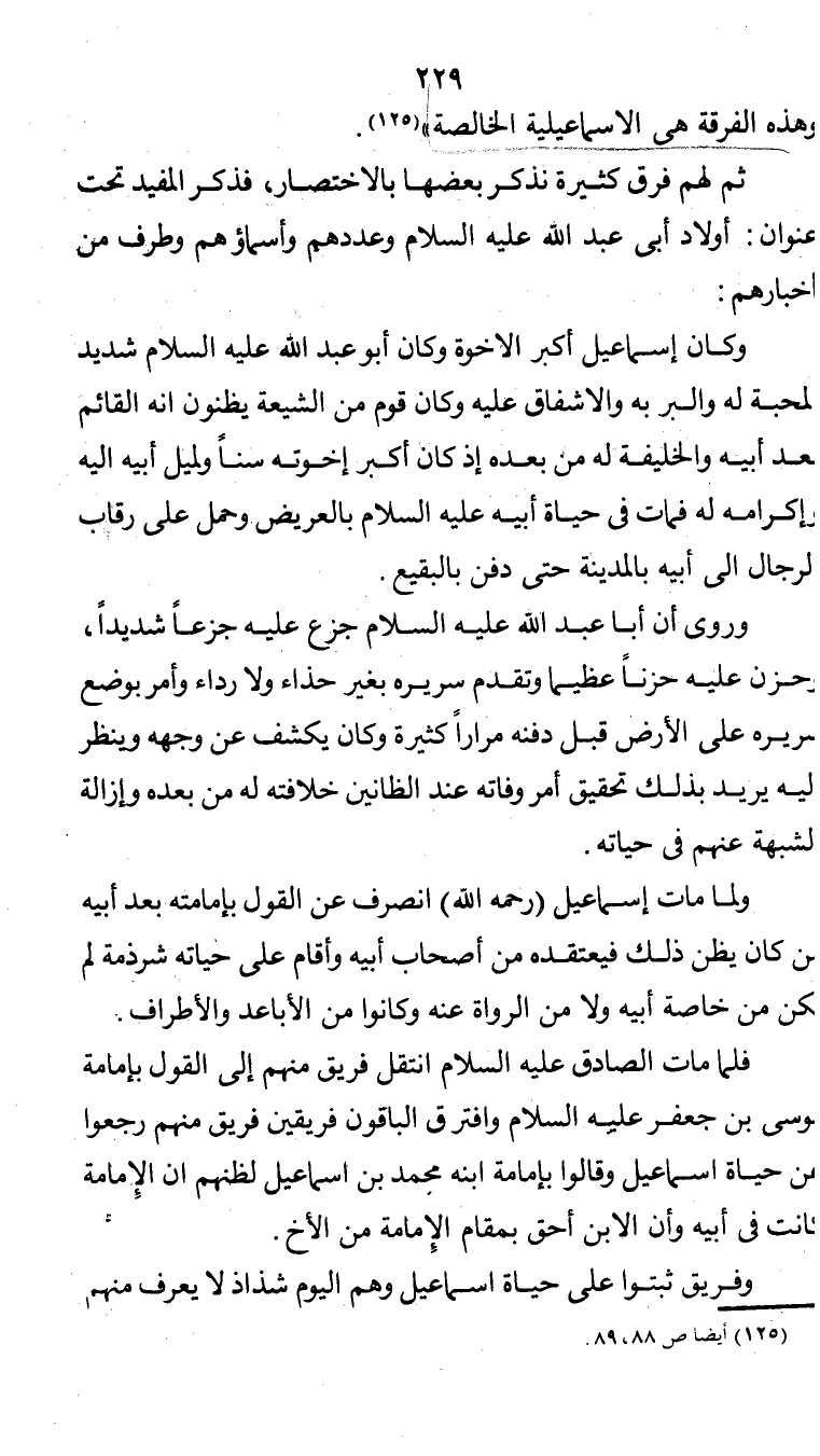 ولما مات إسماعيل (رحمه الله)، إنصرف عن القول بإمامته من بعد أبيه من كان يظن ذلك فيعتقده من أصحاب أبيه، وأقام على حياته شرذمة لم تكن من خاصة أبيه، ولا من الرواة عنه، وكانوا من الأباعد والأطراف.