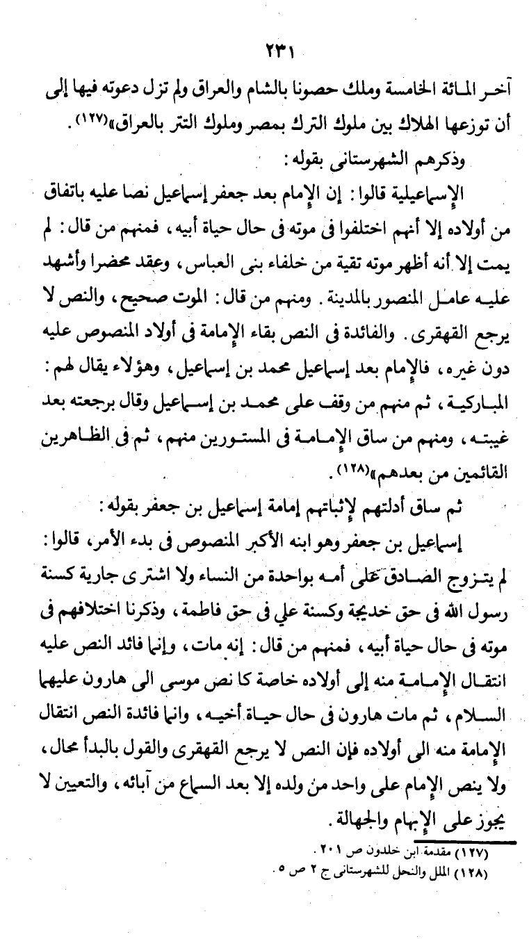 "إسماعيل بن جعفر وهو إبنه الأكبر المنصوص في بدء الأمر، وقالوا: لم يتزوج الصادق على أمه بواحدة من النساء، ولا اشترى جارية، كسنة رسول الله في حق خديجة، وكسنة علي في حق فاطمة. وذكرنا اختلافهم في موته في حال حياة أبيه، فمنهم من قال: إنه مات، وإنما فائد النص عليه، انتقال الإمامة منه إلى أولاده خاصة، كما نص موسى إلى هارون عليهما السلام، ثم مات هارون في حال حياة أخيه، وإنما فائدة النص انتقال الإمامة منه إلى أولاده، فإن النص لا يرجع القهقري، والقول بالبدأ محال، ولا ينص الإمام على واحد من ولده إلا بعد السماع من آبائه، والتعيين لا يجوز على الإبهام والجهالة.