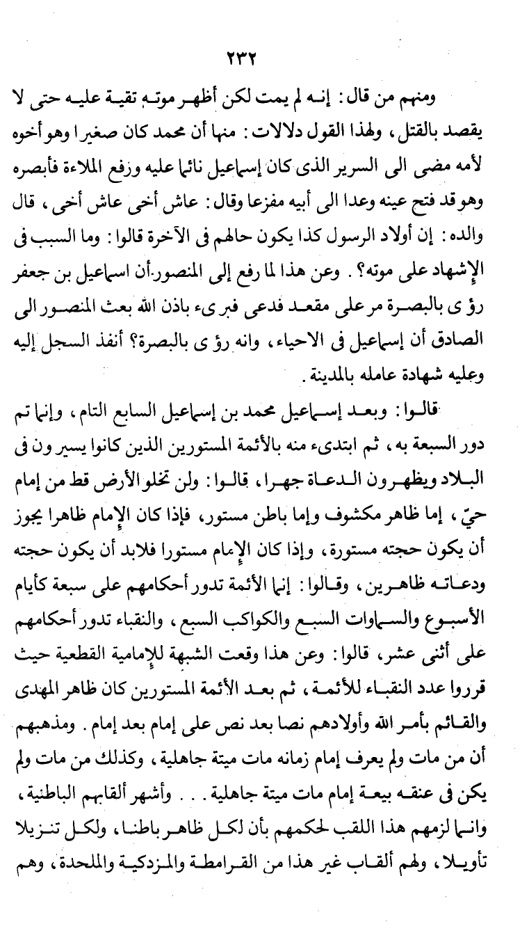 قالوا: وبعد إسماعيل، محمد بن إسماعيل السابع التام، وإنما تم دور السبعة به. ثم ابتدى منه بالأئمة المستورين الذين كانوا يسيرون في البلاد، ويظهرون الدعاة جهراً، قالوا: ولن تخلوا الأرض قط من إمام حيّ، إما ظاهر مكشوف، وإما باطن مستور. فإذا كان الإمام ظاهراً، يجوز أن يكون حجته مستورة، وإذا كان الإمام مستوراً فلابد أن يكون حجته ودعاته ظاهرين، وقالوا: إنما الأئمة تدور أحكامهم على سبعة كأيام الأسبوع والسموات السبع والكواكب السبع. والنقباء تدور أحكامهم على أثنى عشر، قالوا: وعن هذا وقعت الشبهة للإمامية القطعية حيث قرروا عدد النقباء للأئمة، ثم بعد الأئمة المستورين كان ظاهر المهدي والقائم بأمر الله وأولادهم نصاً بعد نص على إمام بعد إمام. ومذهبهم أن من مات ولم يعرف إمام زمانه، مات ميتة جاهلية، وكذلك من مات ولم يكن في عنقه بيعة إمام، مات ميتة جاهلية ... وأشهر ألقابهم الباطنية، وإنما لزمهم هذا اللقب لحكمهم بأن لكل ظاهر باطنا، ولكل تنزيلاً تأويلا.