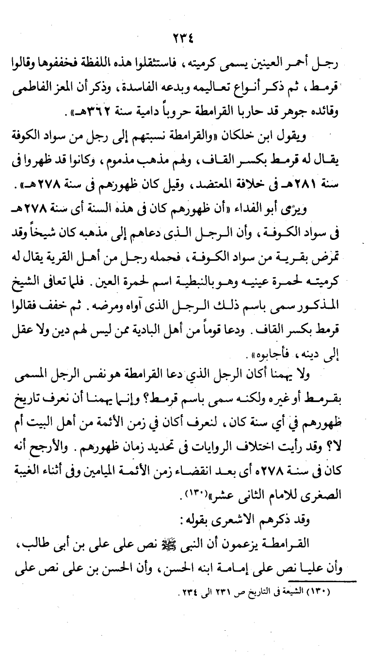 ولايهمنا أكان الرجل الذي دعا القرامطة هو نفس الرجل المسمى بقرمط أو غيره، ولكنه سمي بإسم قرمط، وإنما يهمنا أن نعرف تاريخ ظهورهم في أي سنة كان، لنعرف أكان في زمن الأئمة من أهل البيت أم لا. وقد رأيت إختلاف الروايات في تحديد زمان ظهورهم. والأرجح أنه كان في سنة 278هـ، أي بعد انقضاء زمن الأئمة الميامين، وفي أثناء الغيبة الصغرى للإمام الثاني عشر " (¬1).