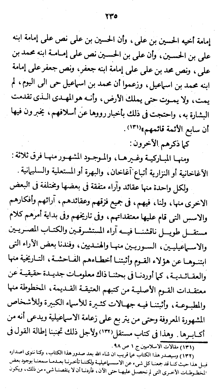 (¬2) وسيصدر هذا الكتاب عما قريب إن شاء الله بعد صدور هذا الكتاب، وكنا ننوي اصداره قبل هذا حيث كنا قد جمعنا كل شئ عن الاسماعيلية ولكننا تأخرنا بعدما سمعنا بوجود بعض المخطوطات الأخرى التي لم نحصل عليها حتى الآن، فأردنا أن لا ينقصنا شئ من ذلك، ويكون البحث كاملاً شاملاً وجامعاً مانعاً قدر الاستطاعة وما ذلك على الله بعزيز.