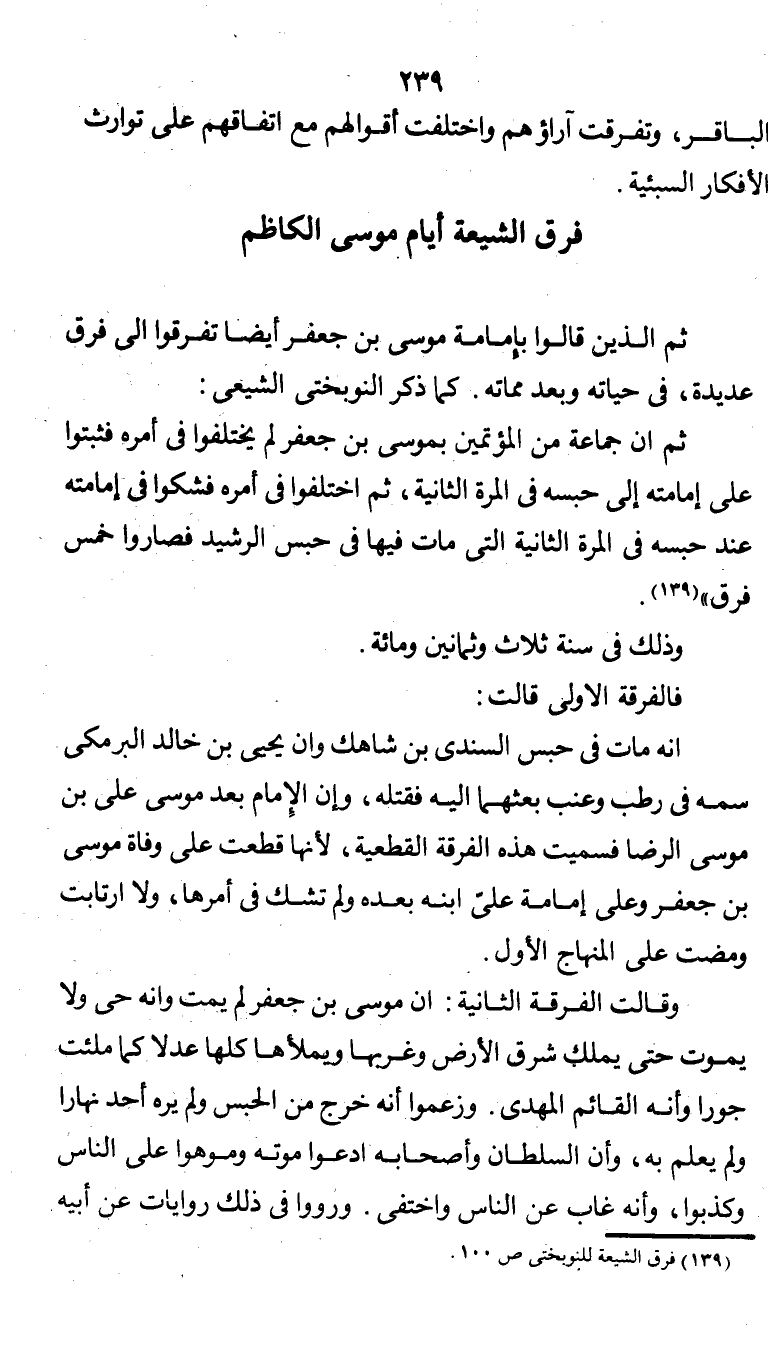 ثم الذين قالوا بإمامة موسى بن جعفر أيضاً تفرقوا إلى فرق عديدة في حياته وبعد مماته. كما ذكر النوبختي الشيعي: