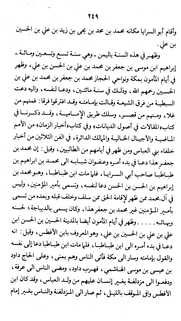 وقد ذكرنا في كتاب " المقالات في أصول الديانات " وفي كتاب " أخبار الزمان " من الأمم الماضية والأجيال الخالية والممالك الدائرة، في الفن الثلاثين من أخبار خلفاء بني العباس ومن ظهر في أيامهم من الطالبيين، وقيل: إن محمد بن جعفر هذا دعا في بدء أمره وعنفوان شبابه إلى محمد بن إبراهيم بن طباطبا صاحب أبي السرايا، فلما مات إبن طباطبا، وهو محمد بن إبراهيم بن الحسن بن الحسن دعا لنفسه، وتسمى بأمير المؤمنين، وليس في آل محمد ممن ظهر لإقامة الحق ممن سلف وخلف قبله وبعده من تسمى بأمير المؤمنين غير محمد بن جعفر هذا، وكان يُسمى بالديباجة، لحسنه وبهائه ... وظهر في أيام المأمون أيضاً بالمدينة، الحسين بن الحسن إبن علي بن علي بن الحسين بن علي، وهو المعروف بإبن الأفطس. وقيل: أنه دعا في بدء أمره إلى إبن طباطبا، فلما مات إبن طباطبا، دعا إلى نفسه والقول بإمامته، وسار إلى مكة، فأتى الناس وهم بمنى، وعلى الحجاج داود بن عيسى بن موسى الهاشمي، فهرب داود، ومضى الناس إلى عرفة، ودفعوا إلى مزدلفة بغير إنسان عليهم من ولد العباس. وقد كان إبن الأفطس وافى الموقف بالليل. ثم صار إلى المزدلفة والناس بغير إمام