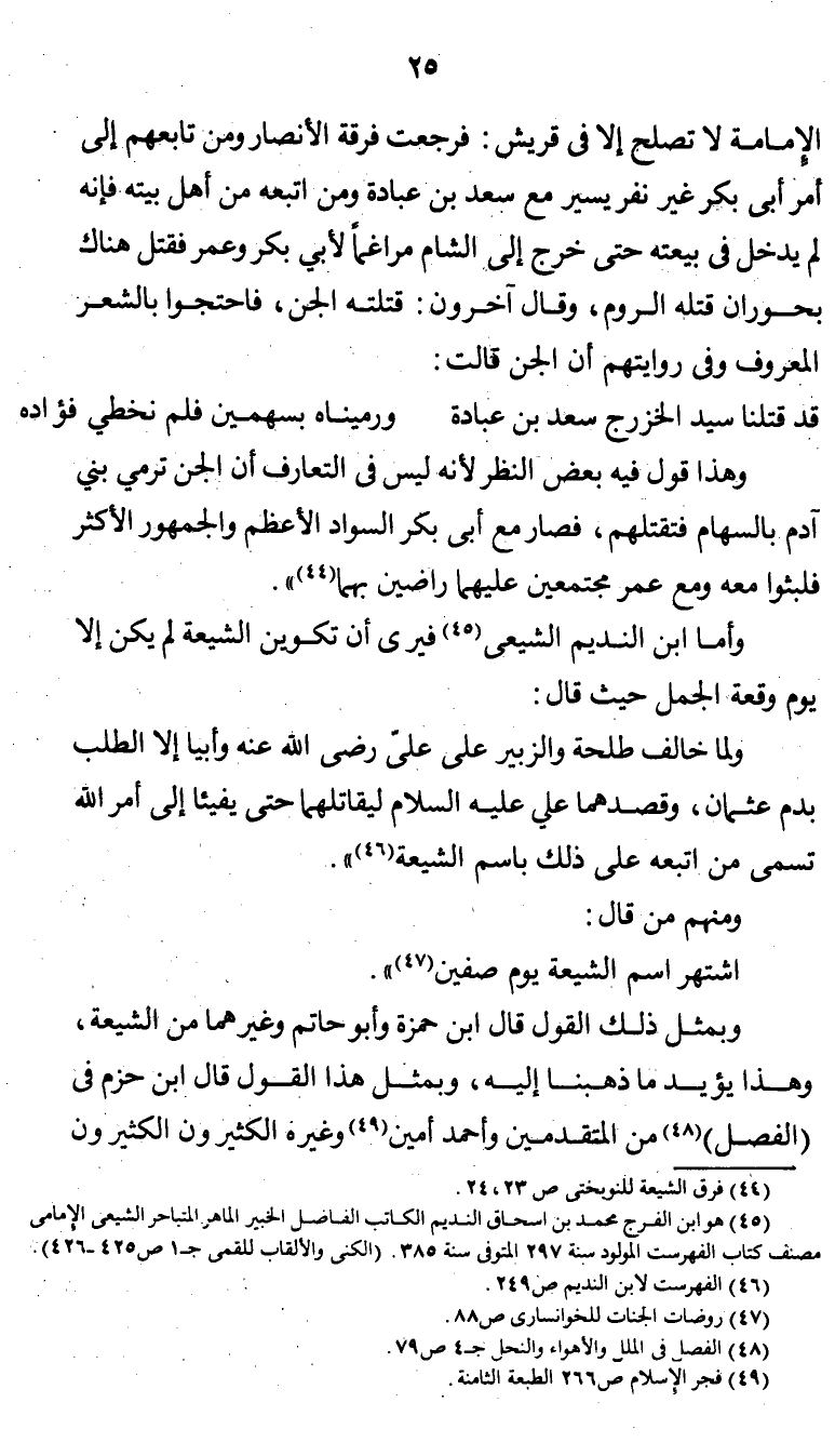 وهذا قول فيه بعض النظر لأنه ليس في التعارف أن الجن ترمي بني آدم بالسهام فتقتلهم فصار مع أبي بكر السواد الأعظم والجمهور الأكثر فلبثوا معه ومع عمر مجتمعين عليهما راضين بهما (¬1) "